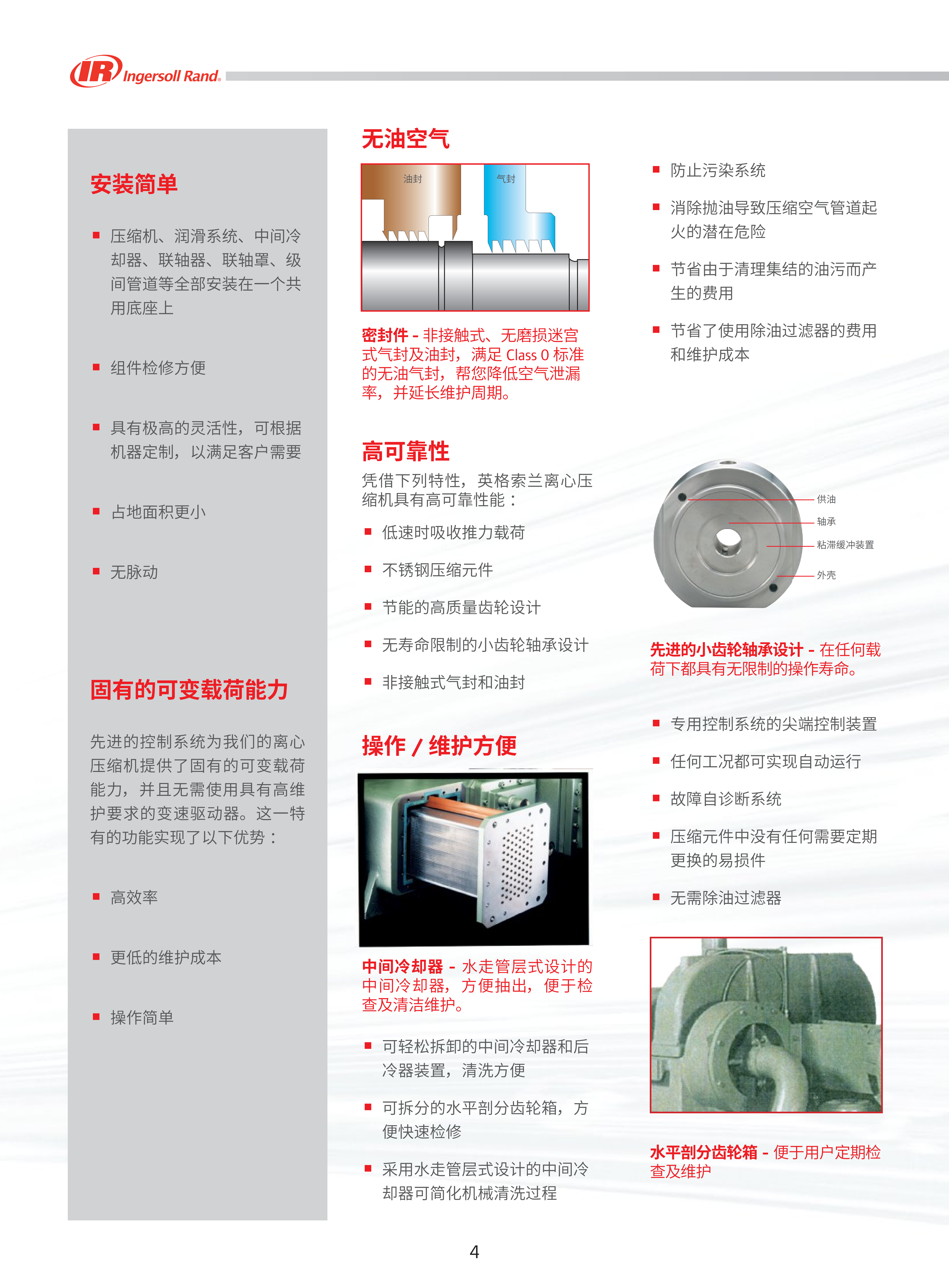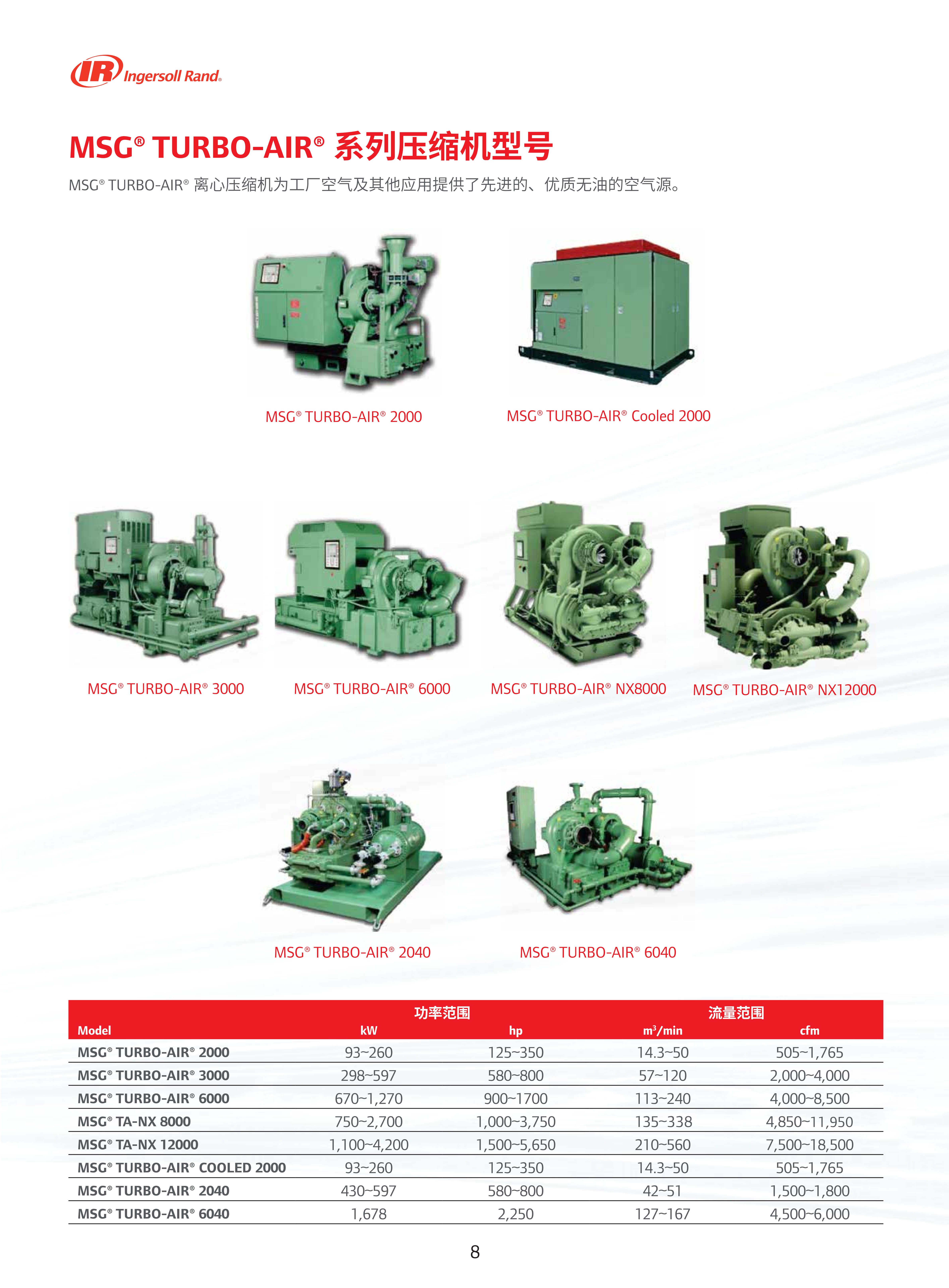 英格索兰MSG® TURBO-AIR®系列工业用无油离心式空气压缩机的产品介绍,核心围绕品牌实力、产品技术优势、成本效益、型号规格、制造能力及配套服务等展开,凸显该系列压缩机在工业应用中的高效、经济、可靠特性。