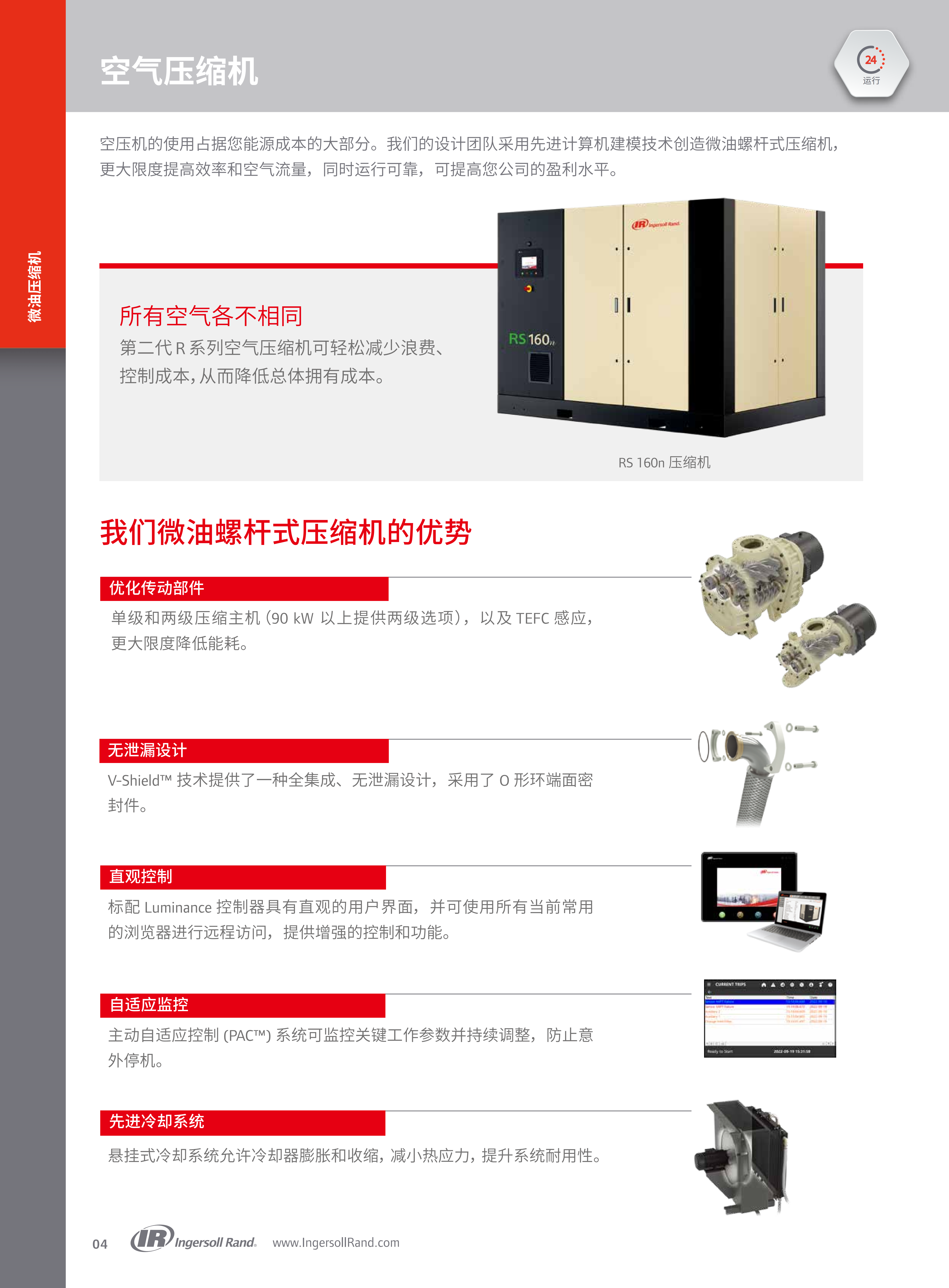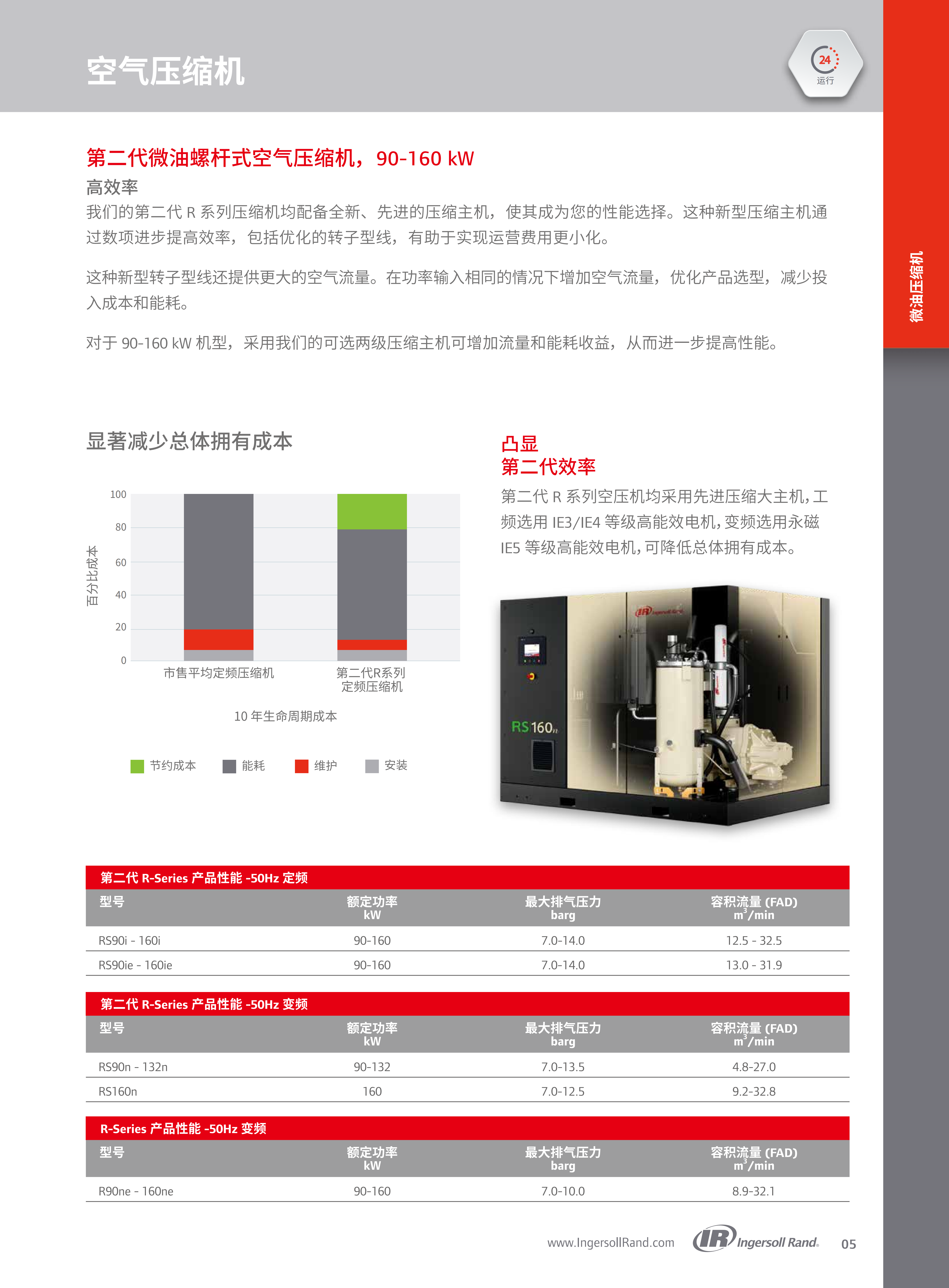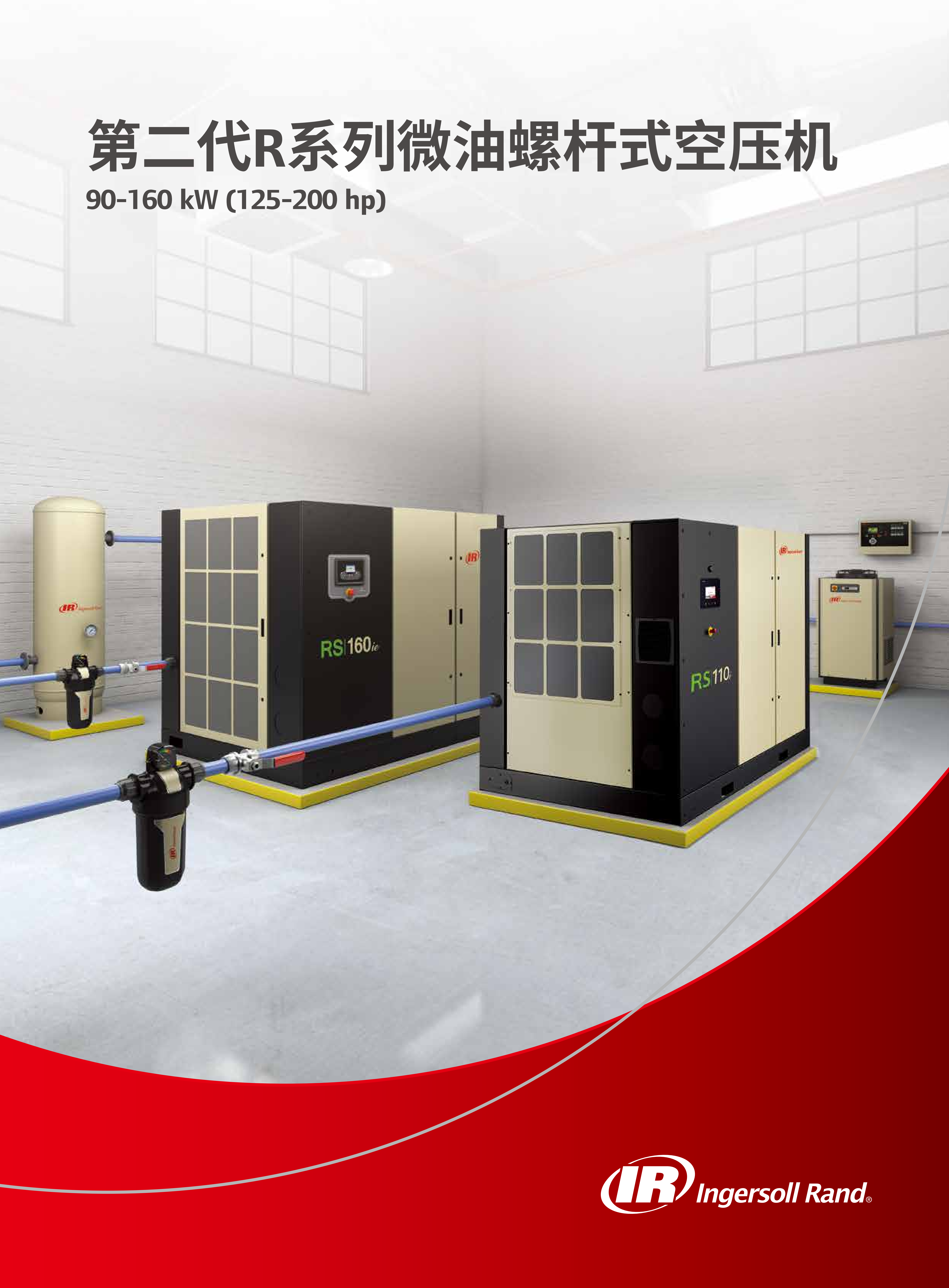 英格索兰第二代R系列90-160kW(125-200hp)微油螺杆式空压机的产品介绍,核心围绕产品技术优势、性能参数、配套设备、全生命周期服务及行业应用展开,凸显其高效、智能、可靠的核心特点,以及为工业用户降低总体拥有成本(TCO)的核心价值。