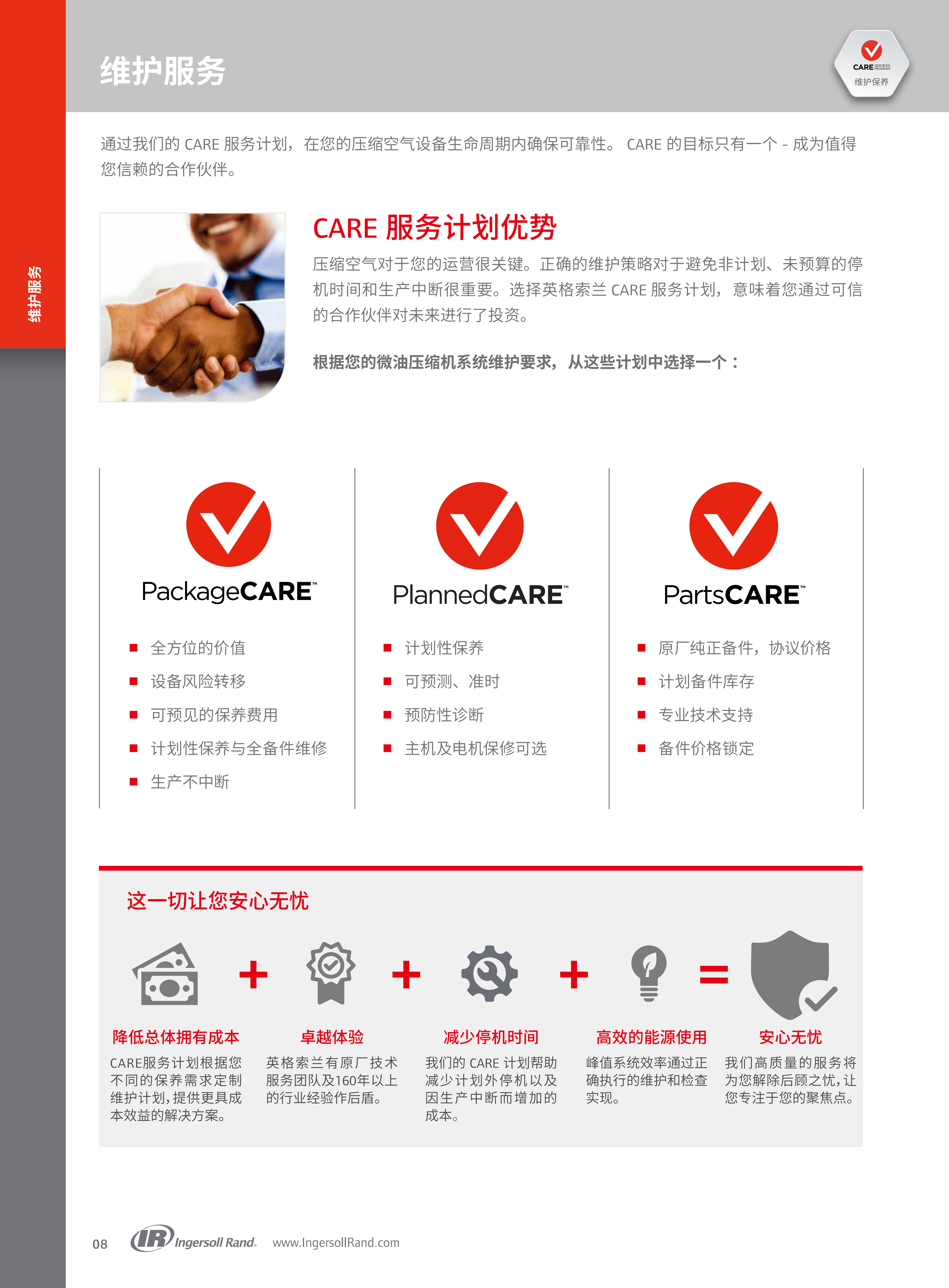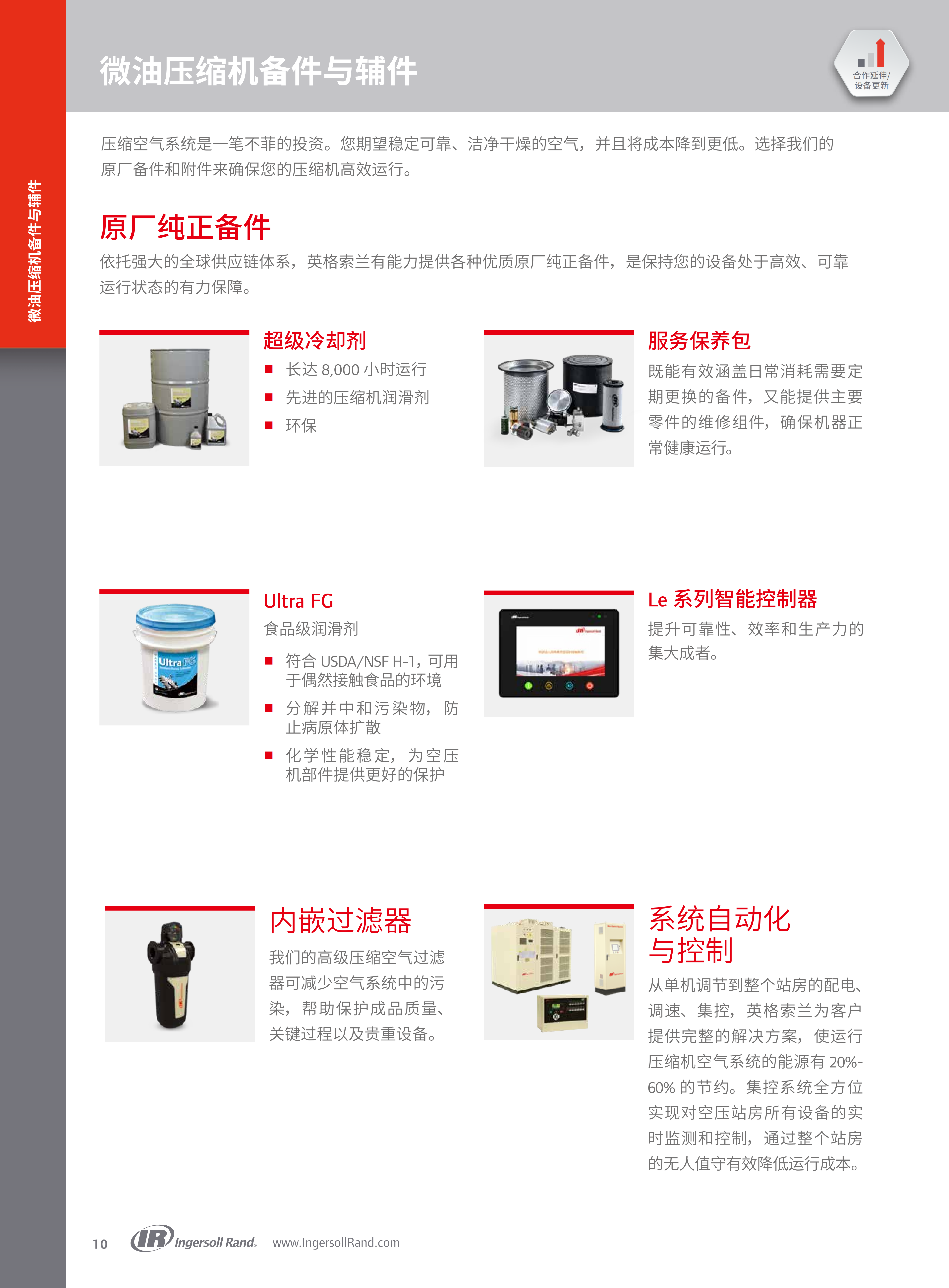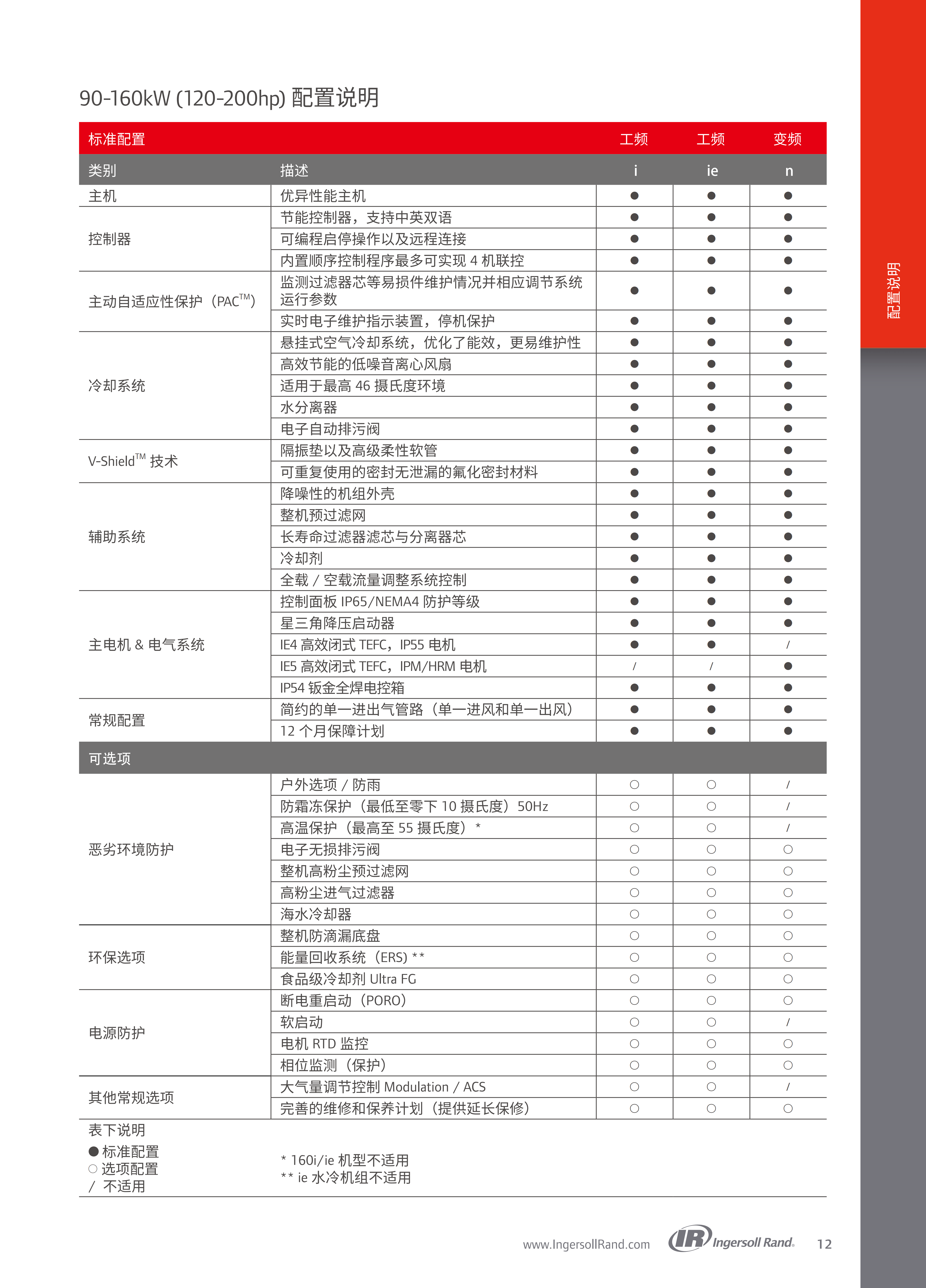 涵盖优异性能主机、中英双语节能控制器、PAC™保护系统、悬挂式冷却系统、V-Shield™无泄漏组件、IE4(工频)/IE5(变频)高能效电机、电子自动排污阀、降噪外壳、12个月保障计划等,控制面板达IP65防护等级,电控箱IP54防护。