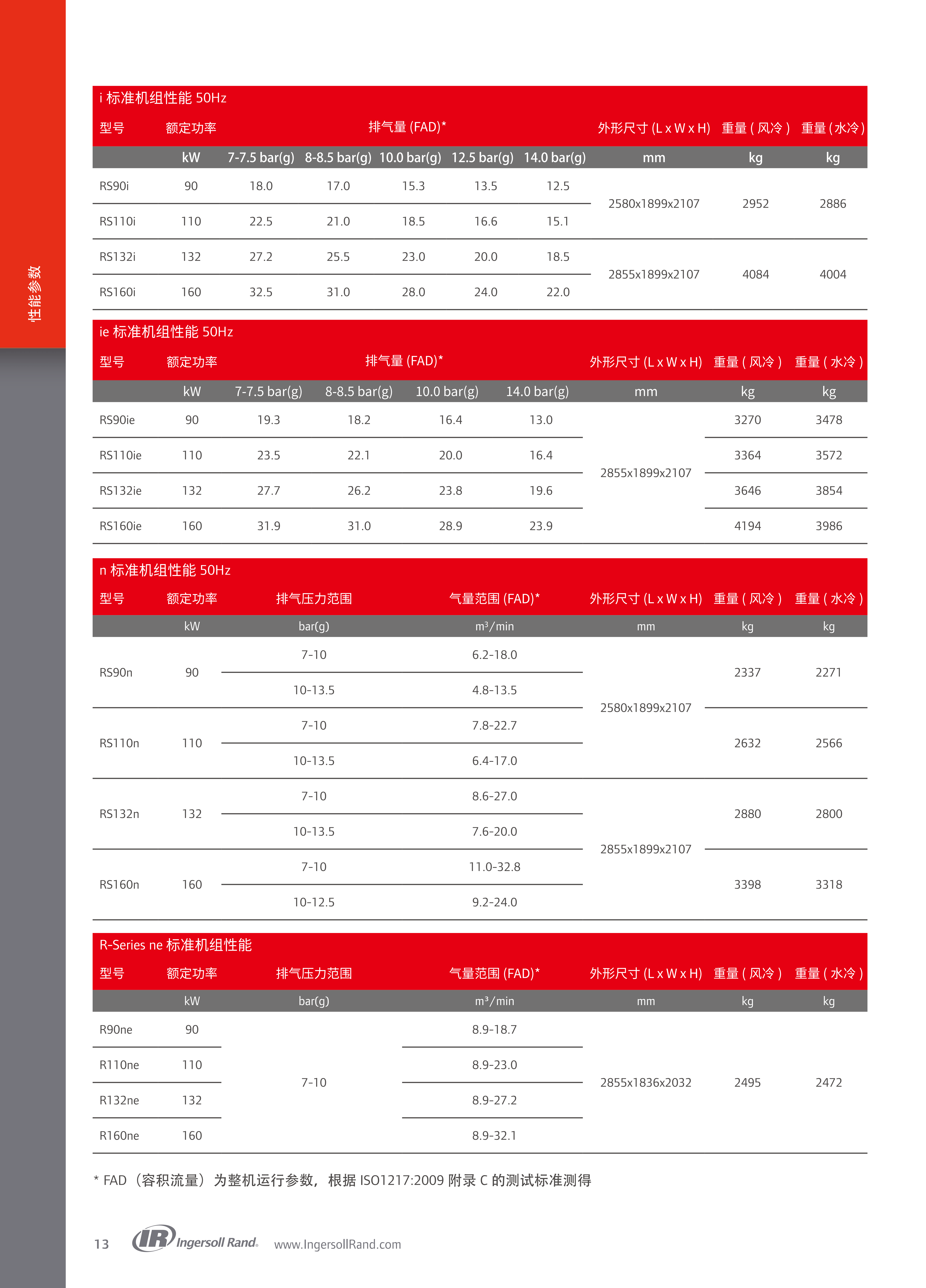 第二代R系列分定频(i/ie)、变频(n/ne) 两大品类,核心参数如下(容积流量FAD按ISO1217:2009附录C测试):