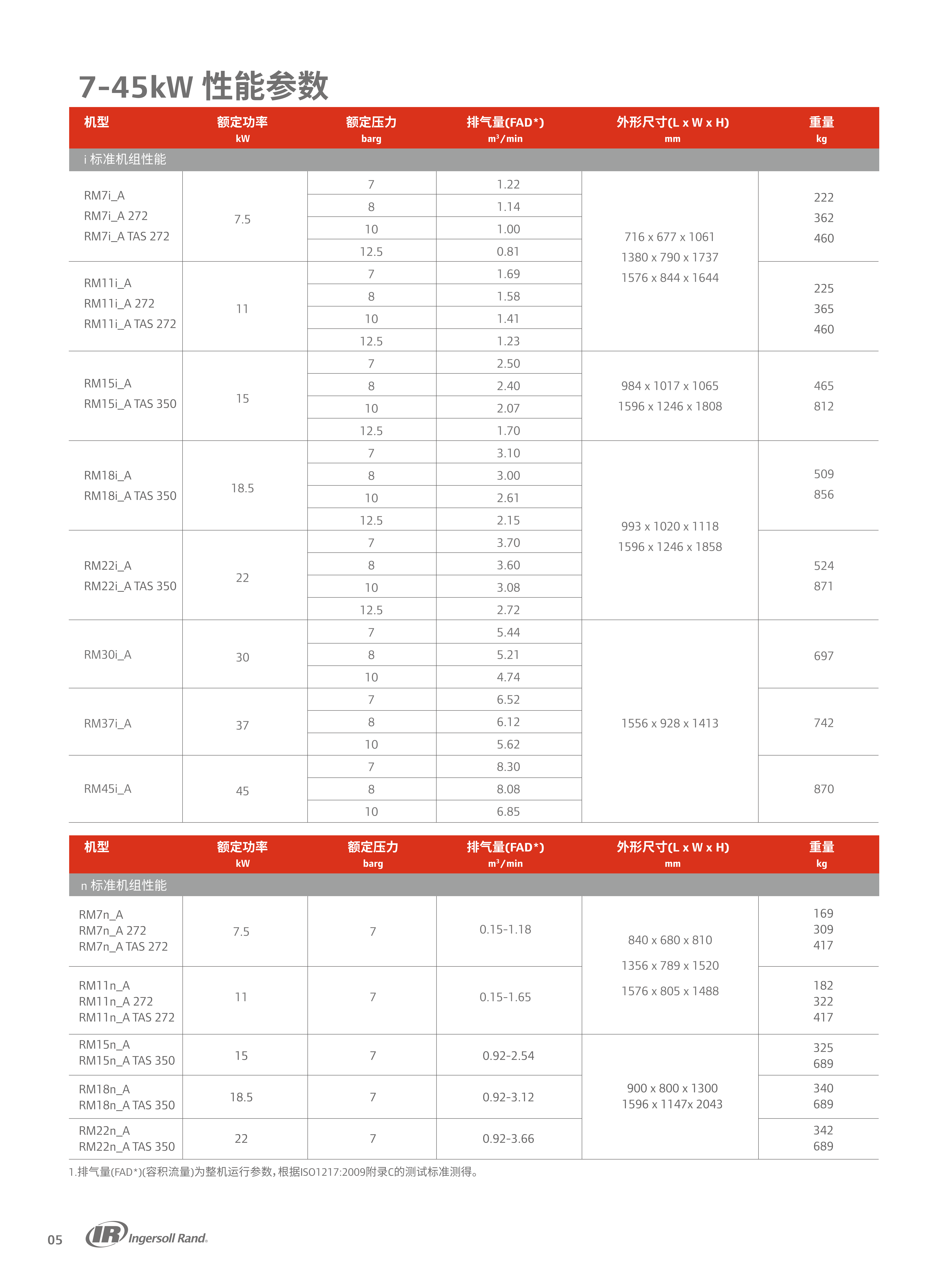 系列分i型(固定转速)和n型(变动转速),额定功率覆盖7.5-45kW,额定压力7-12.5barg,排气量按ISO1217:2009附录C标准测试,不同机型对应不同外形尺寸与重量,例如: