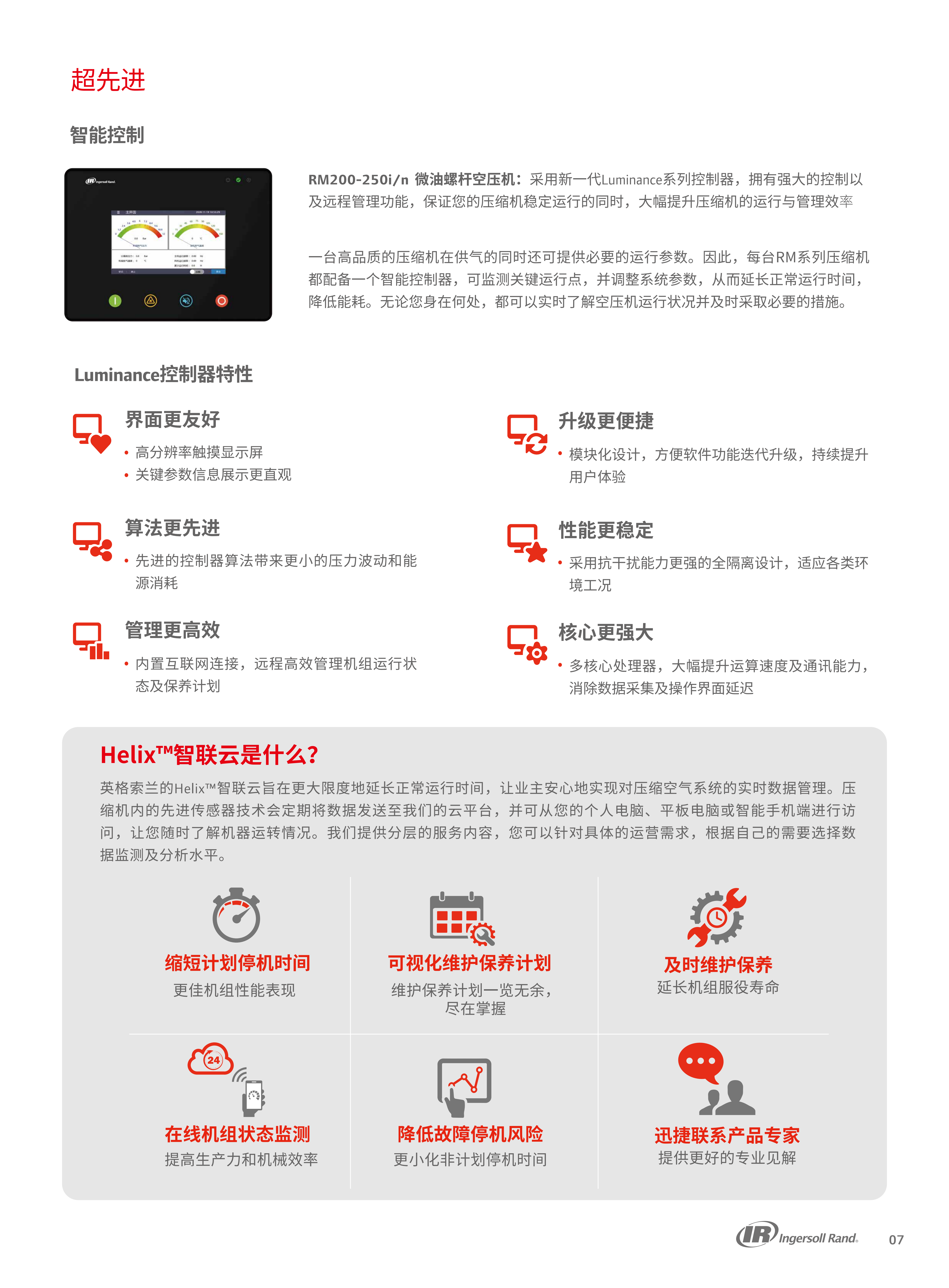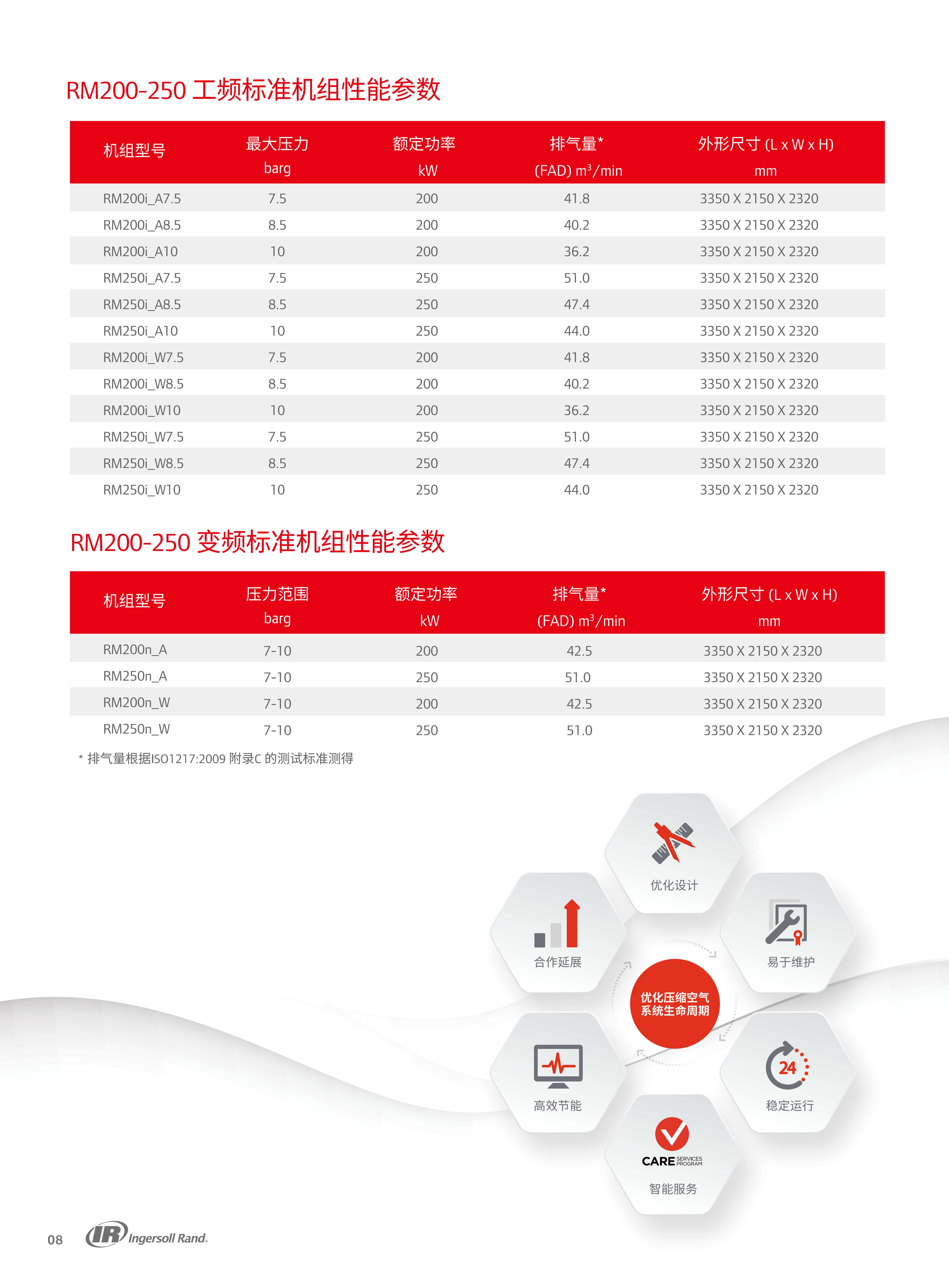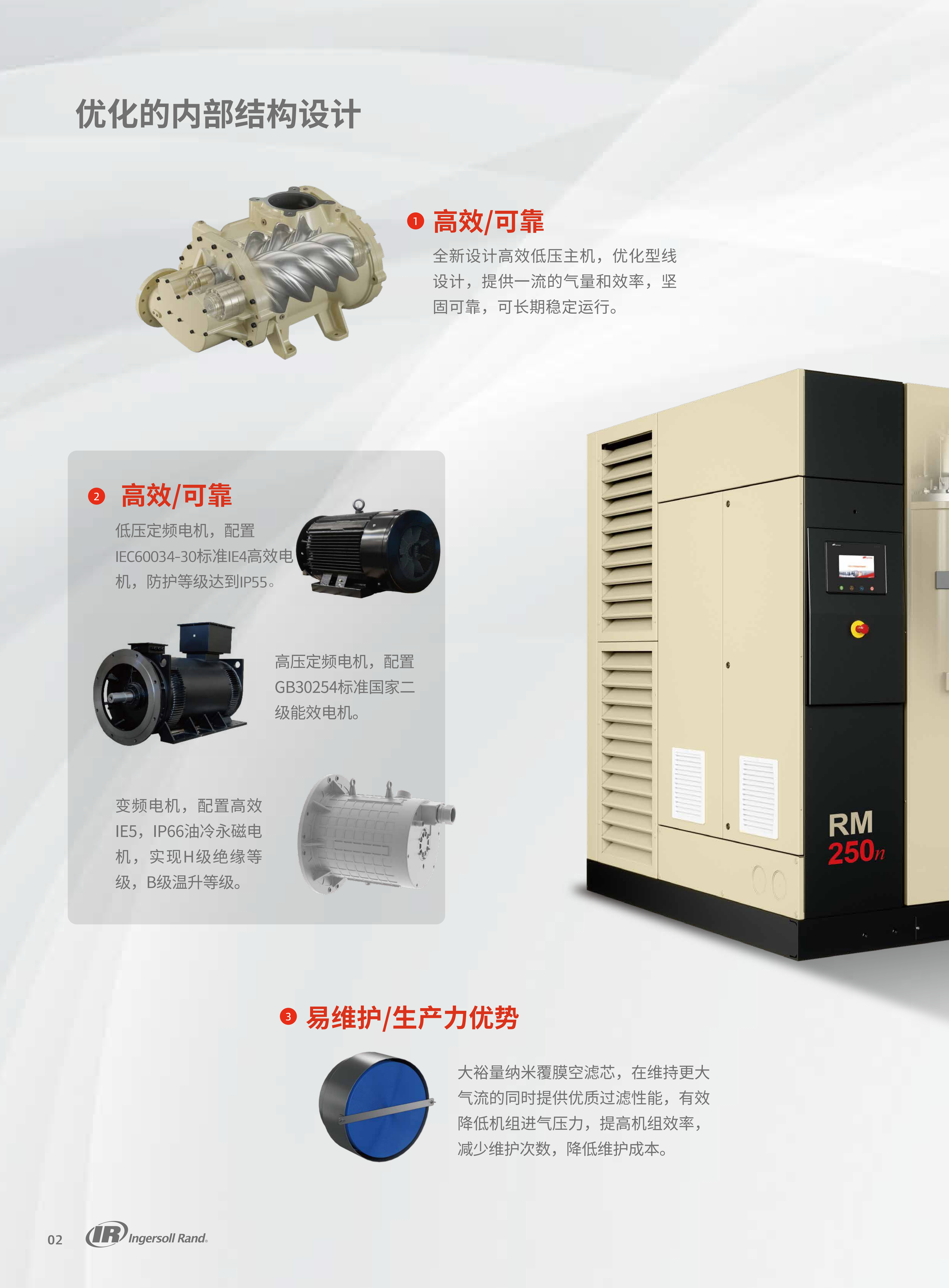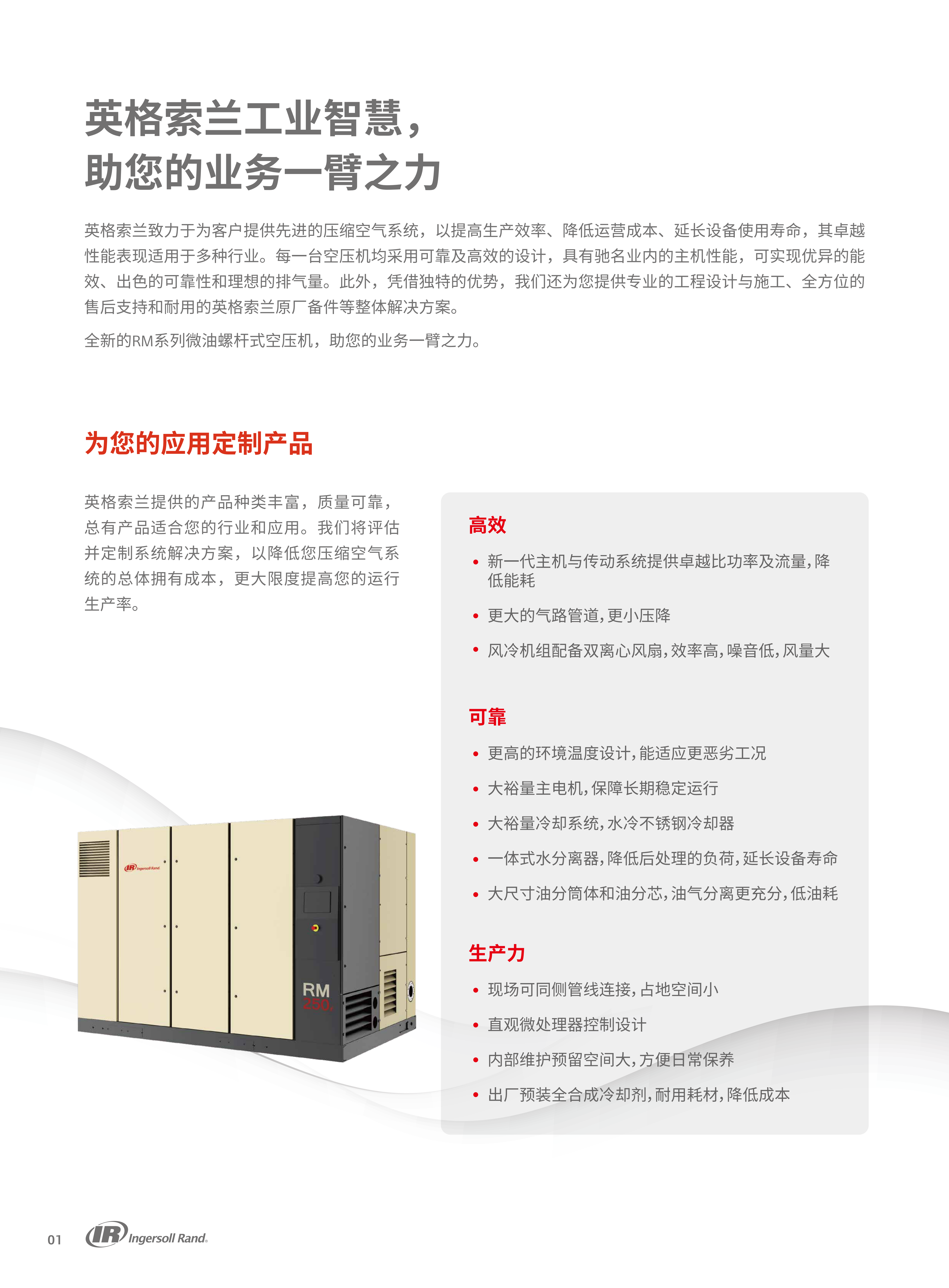 英格索兰RM200-250系列微油螺杆式空压机产品介绍,核心围绕该系列产品高效节能、稳定可靠、智能便捷的核心优势展开,同时公布了详细性能参数、配置选项及品牌配套服务,适用于多行业压缩空气需求,可定制化系统解决方案以降低总体拥有成本。