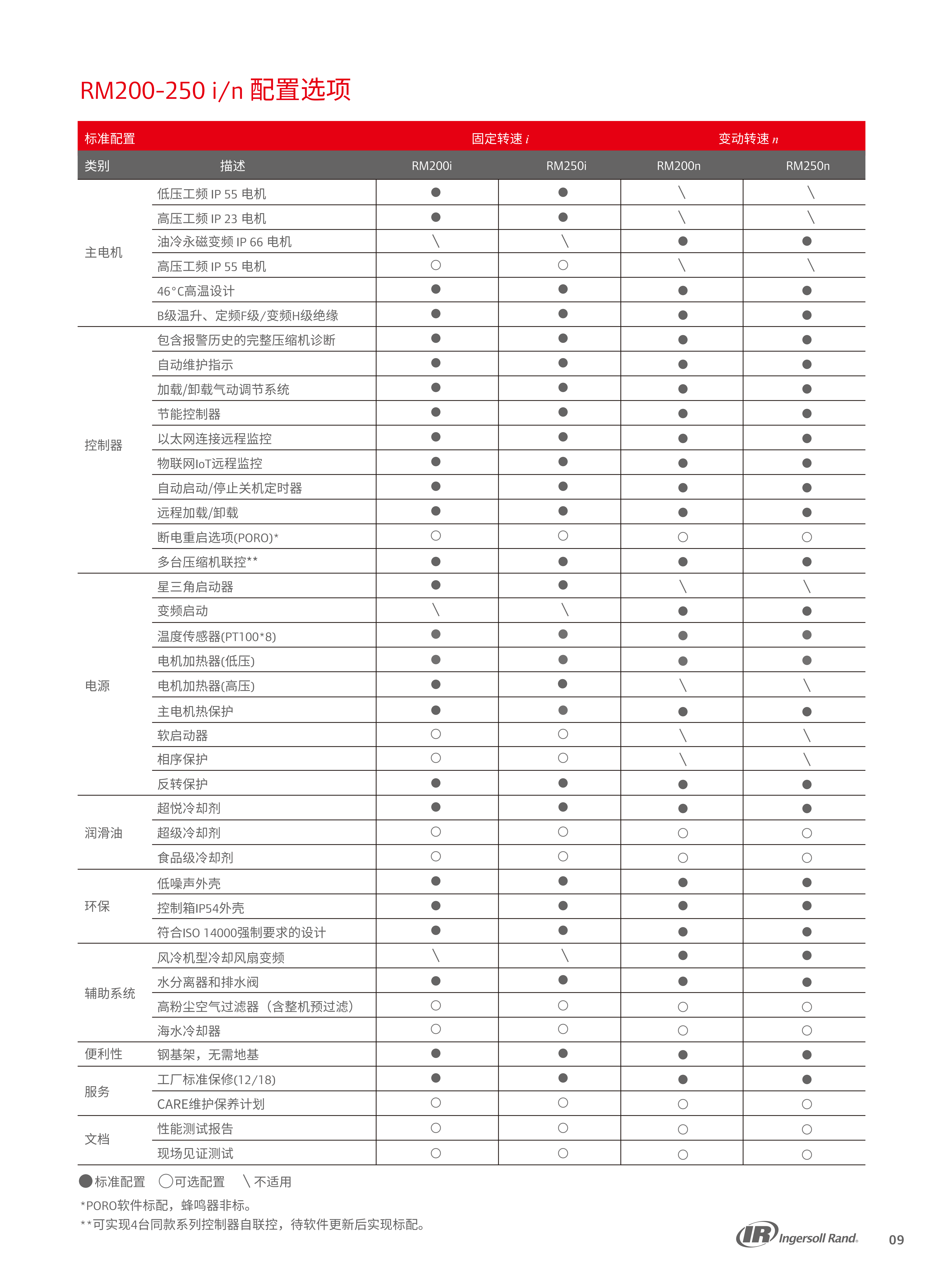 RM200i/250i(工频)、RM200n/250n(变频)均提供标准配置+可选配置,覆盖电机、控制器、电源、润滑油、环保、辅助系统等多维度,满足不同行业定制需求: