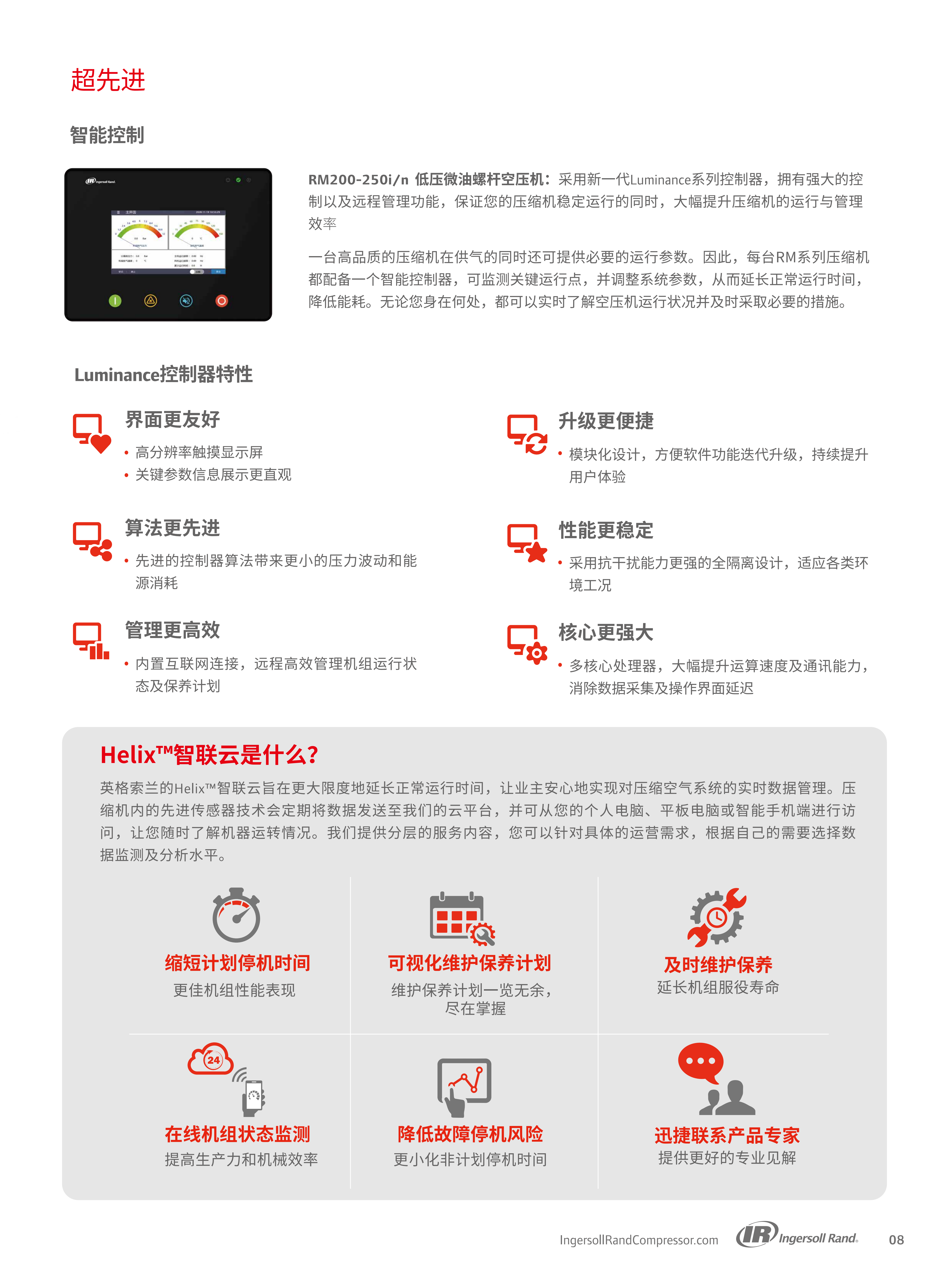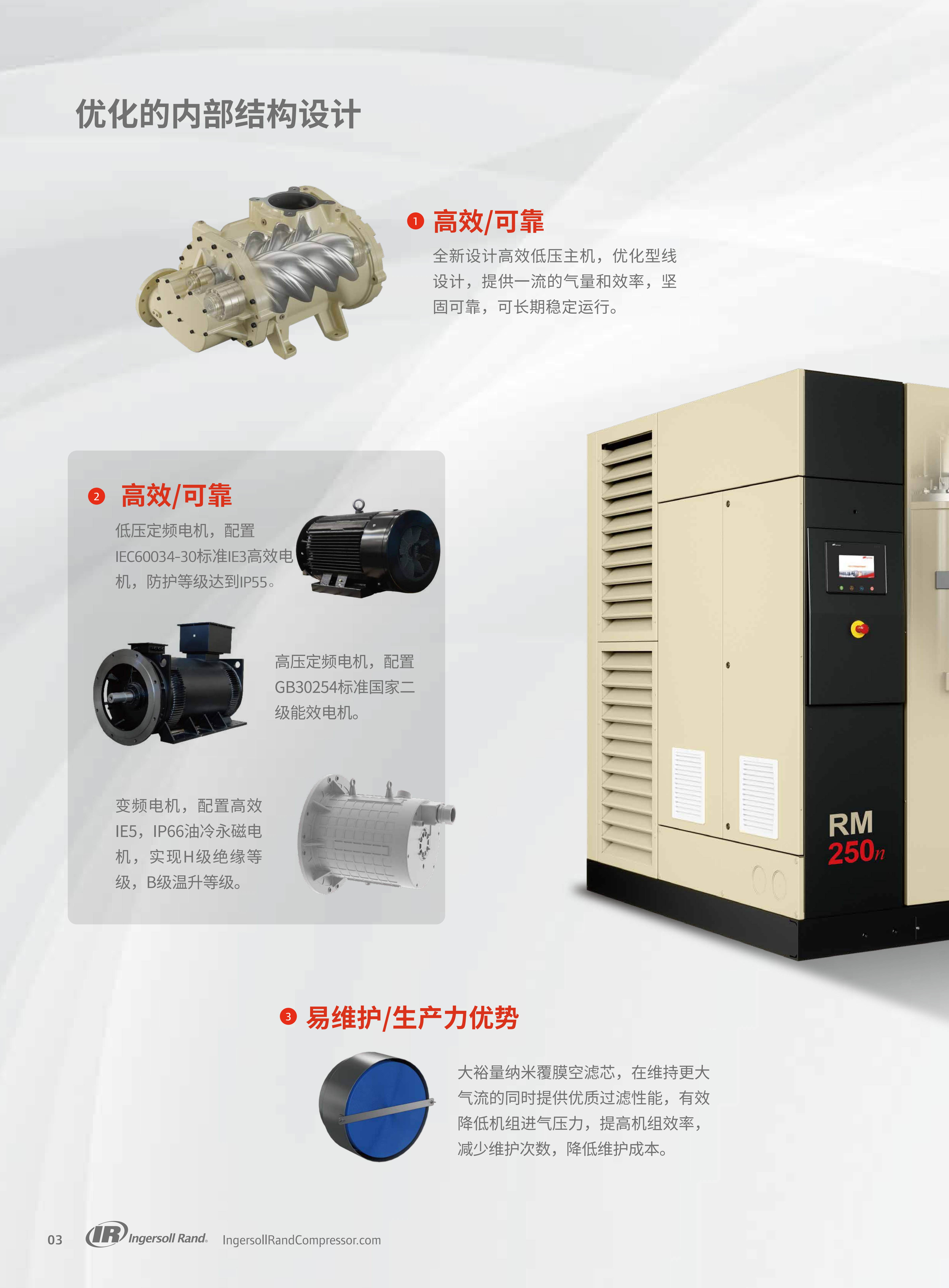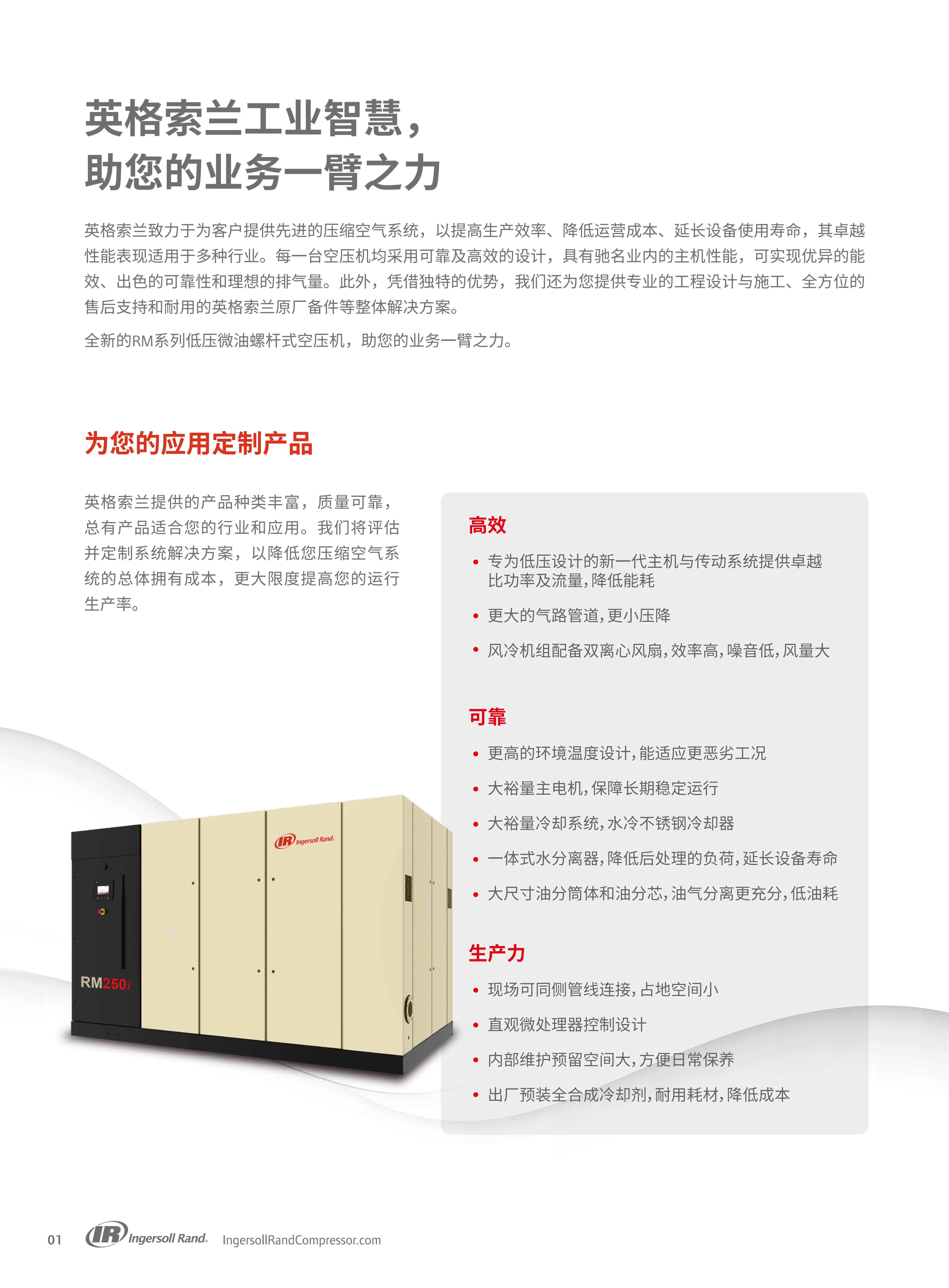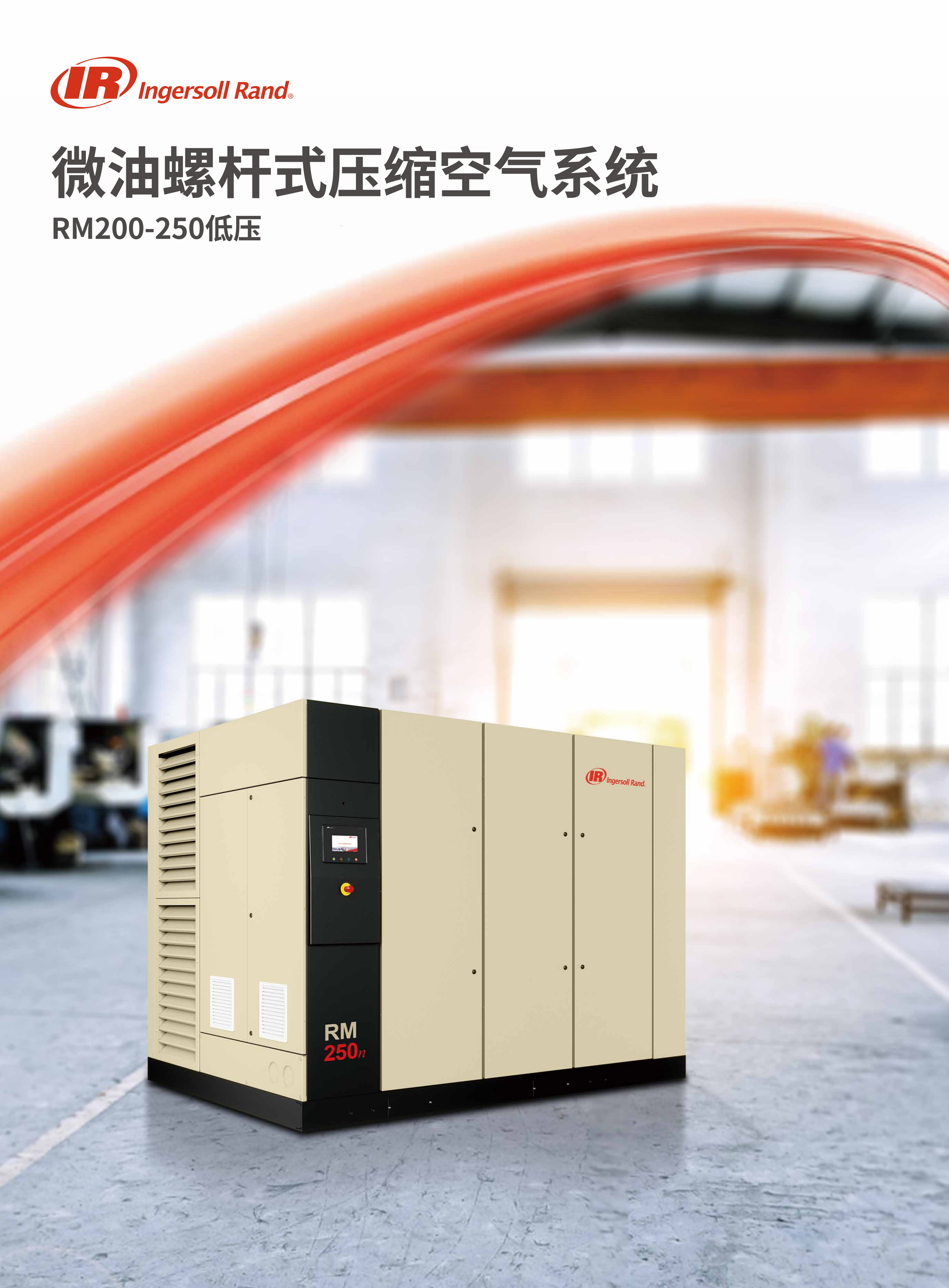 英格索兰RM200-250系列低压微油螺杆式空压机的产品介绍,核心围绕该系列产品高效节能、稳定可靠、智能便捷的特性展开,同时介绍了产品应用、性能参数、配置选项及品牌服务等内容,旨在为各行业提供定制化压缩空气系统解决方案,降低总体拥有成本,提升生产效率。