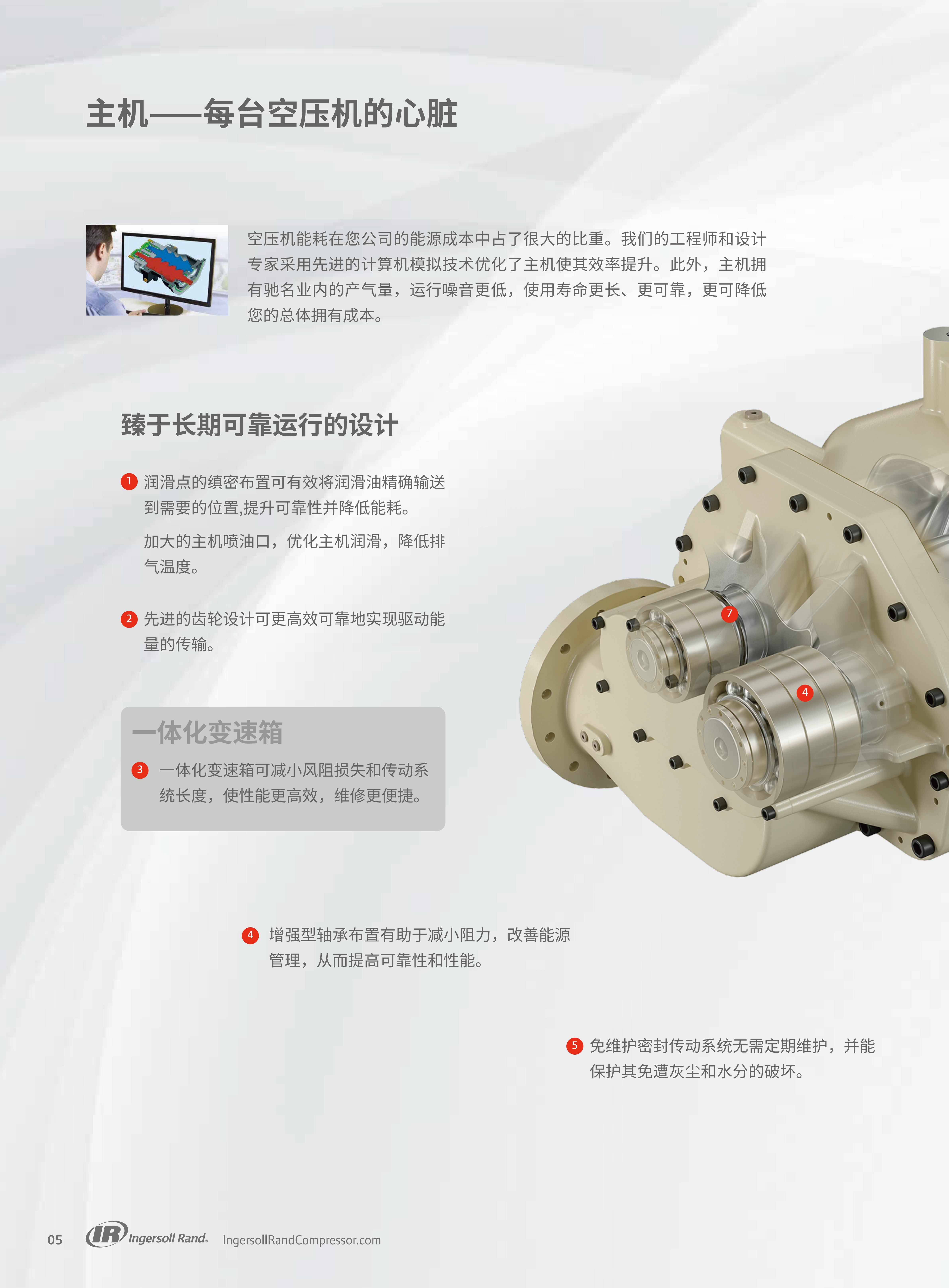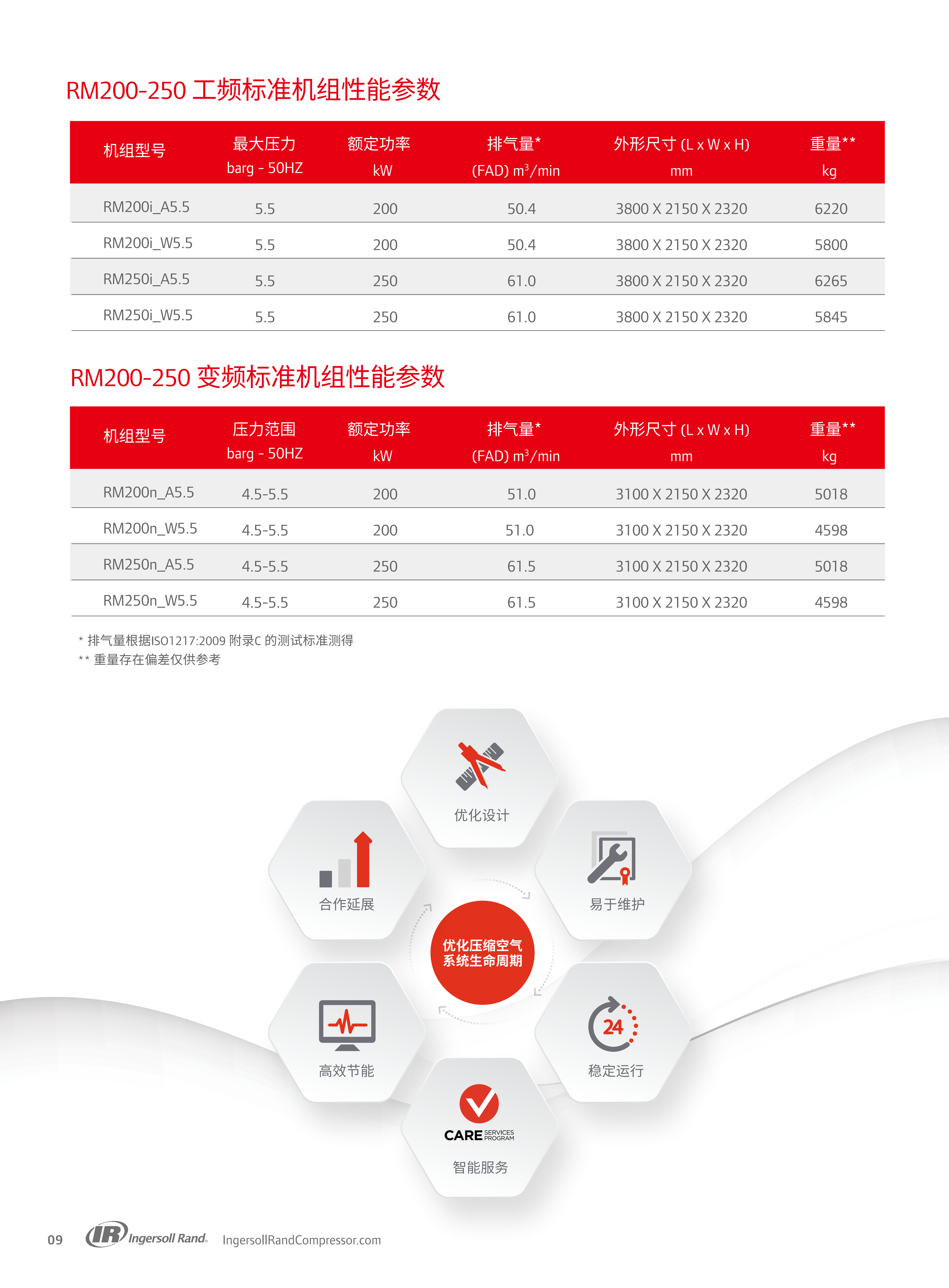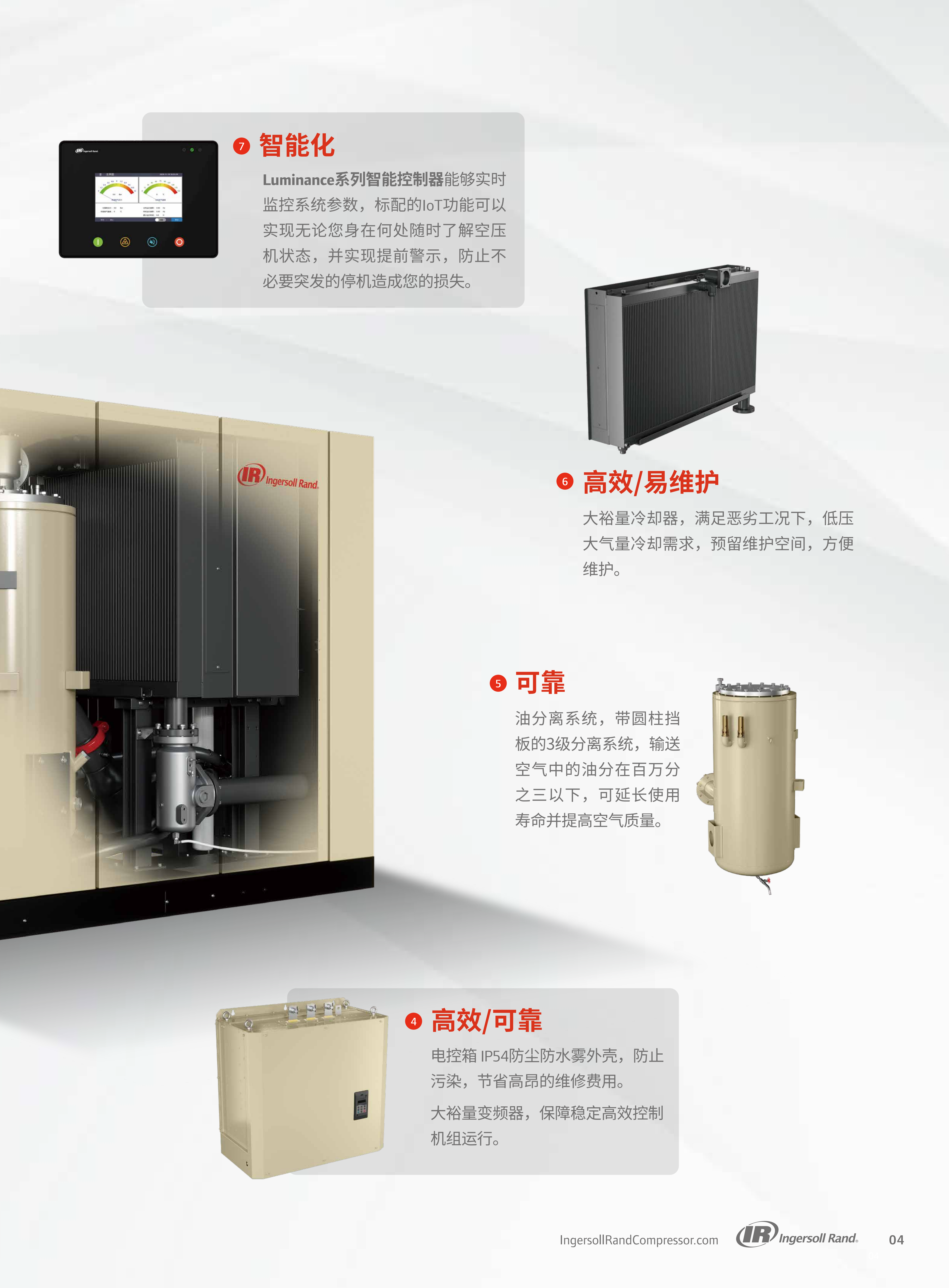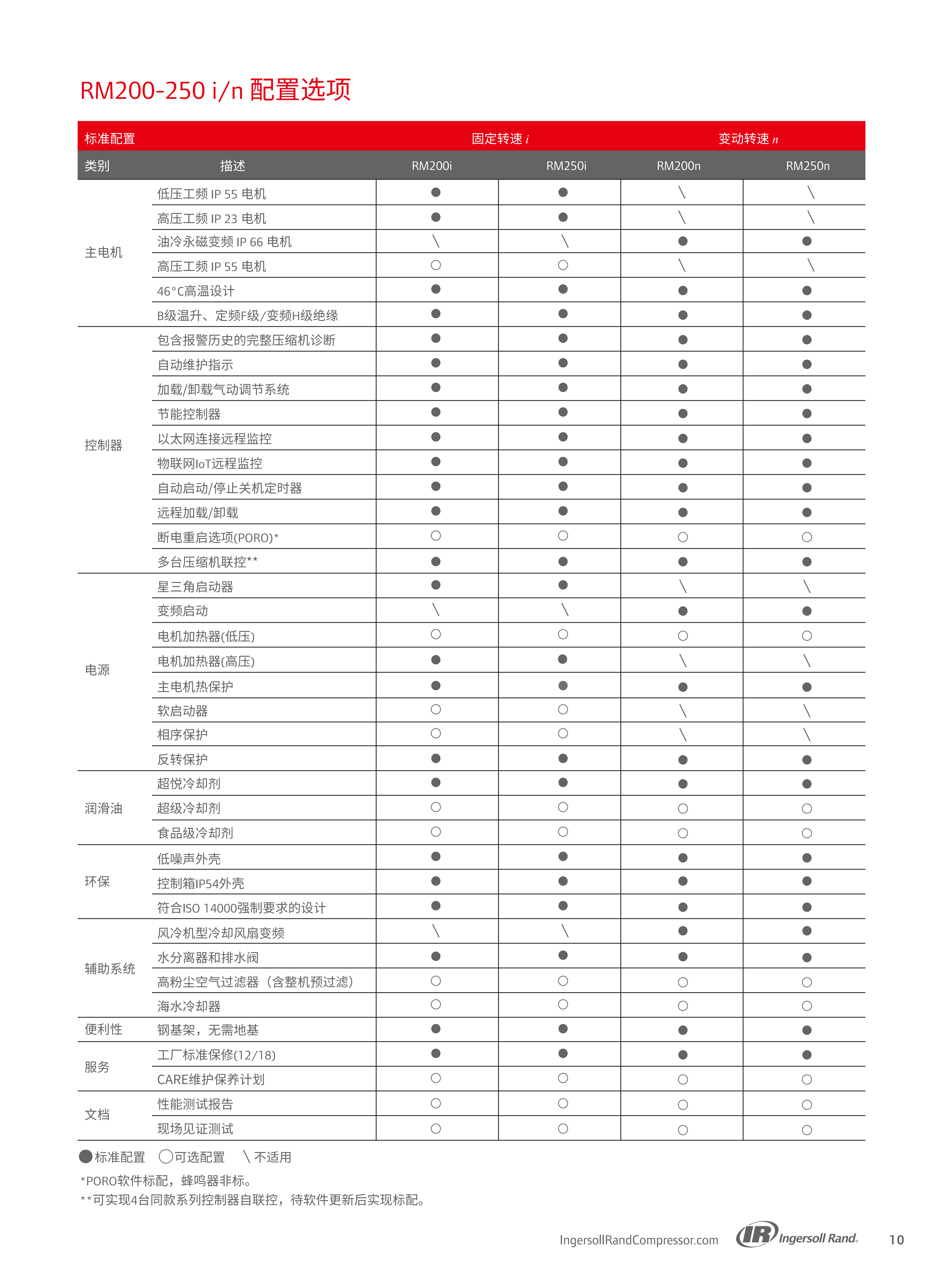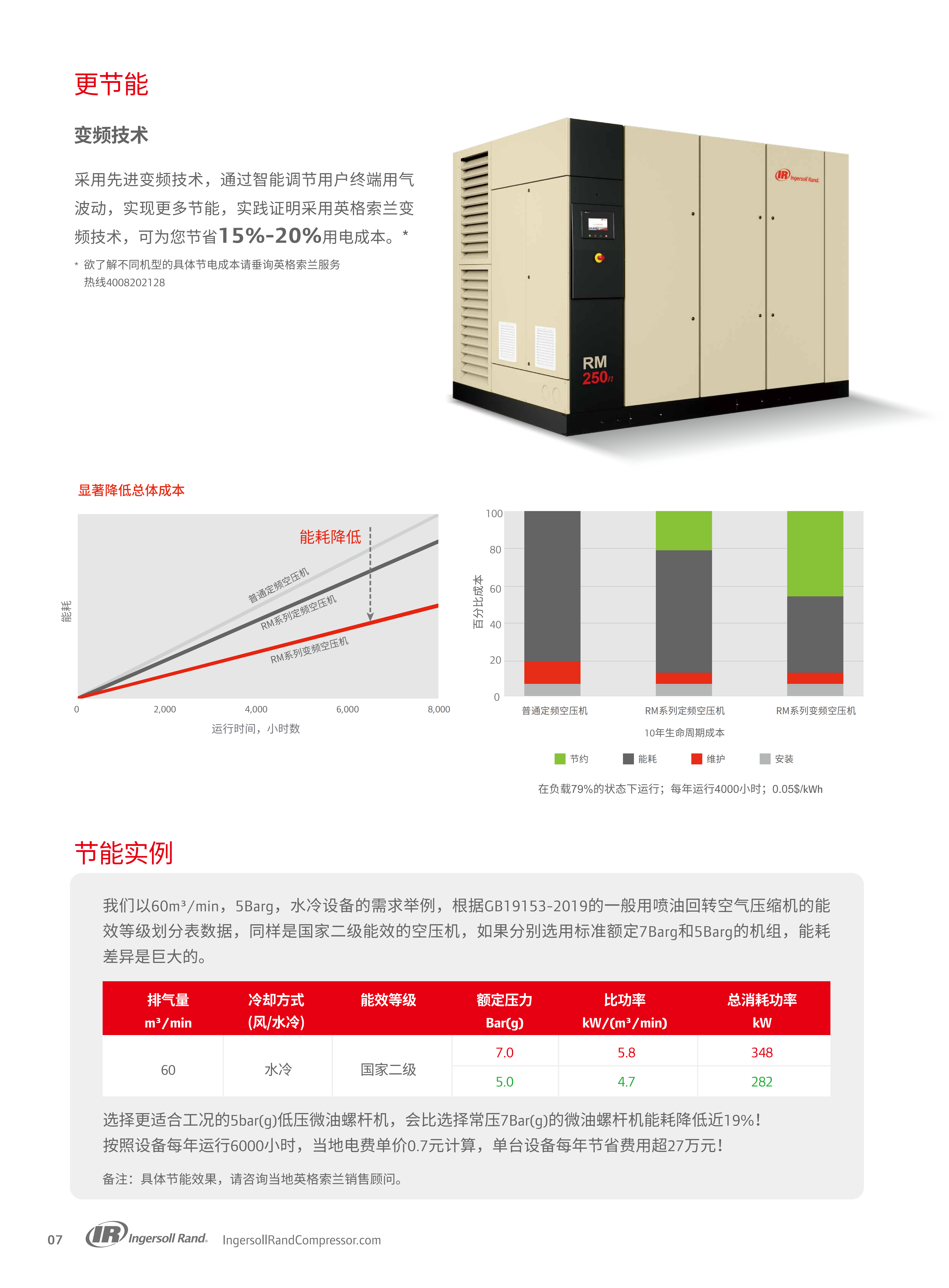 英格索兰RM200-250系列低压微油螺杆式空压机的产品介绍,核心围绕该系列产品高效节能、稳定可靠、智能便捷的特性展开,同时介绍了产品应用、性能参数、配置选项及品牌服务等内容,旨在为各行业提供定制化压缩空气系统解决方案,降低总体拥有成本,提升生产效率。