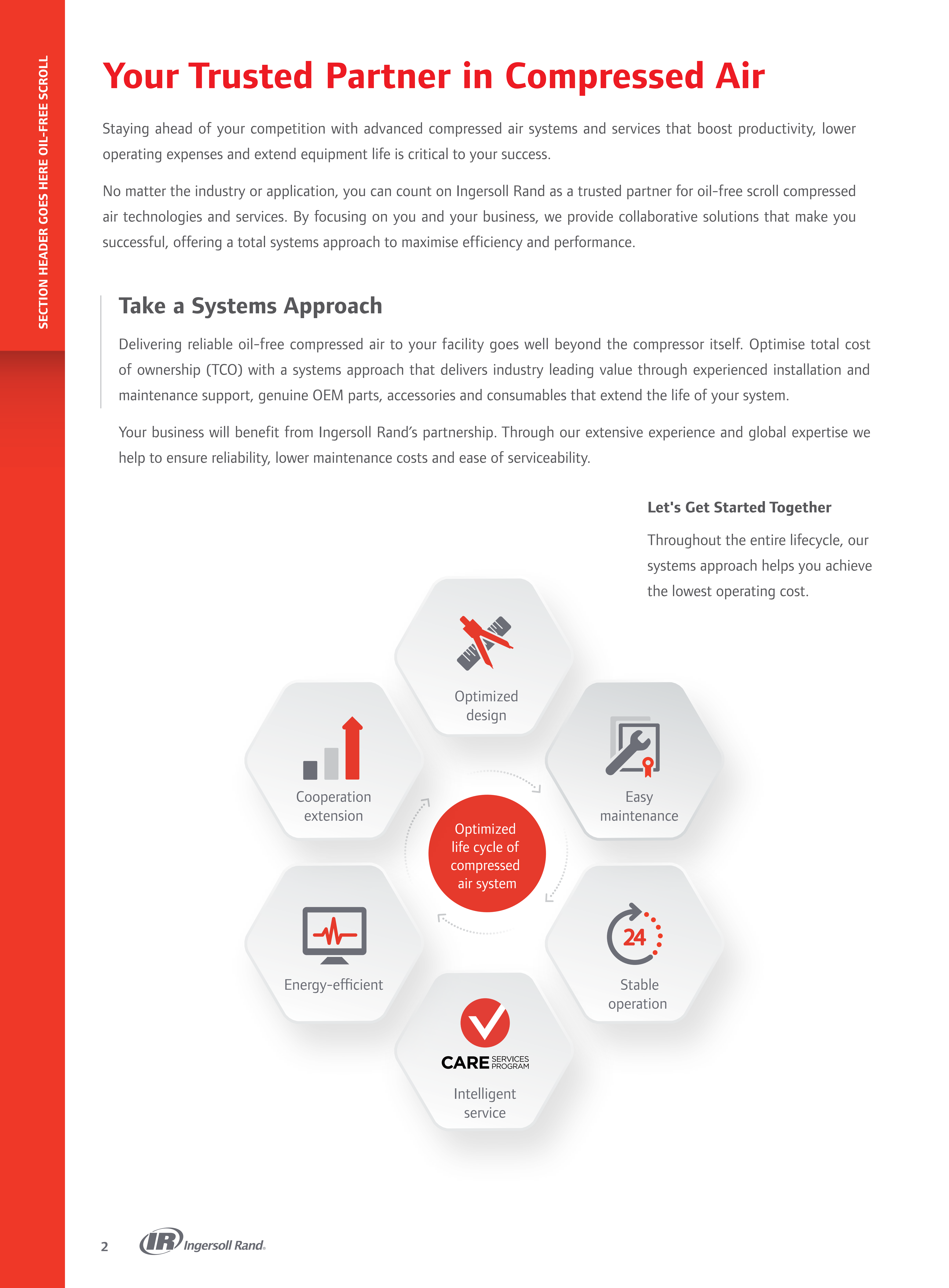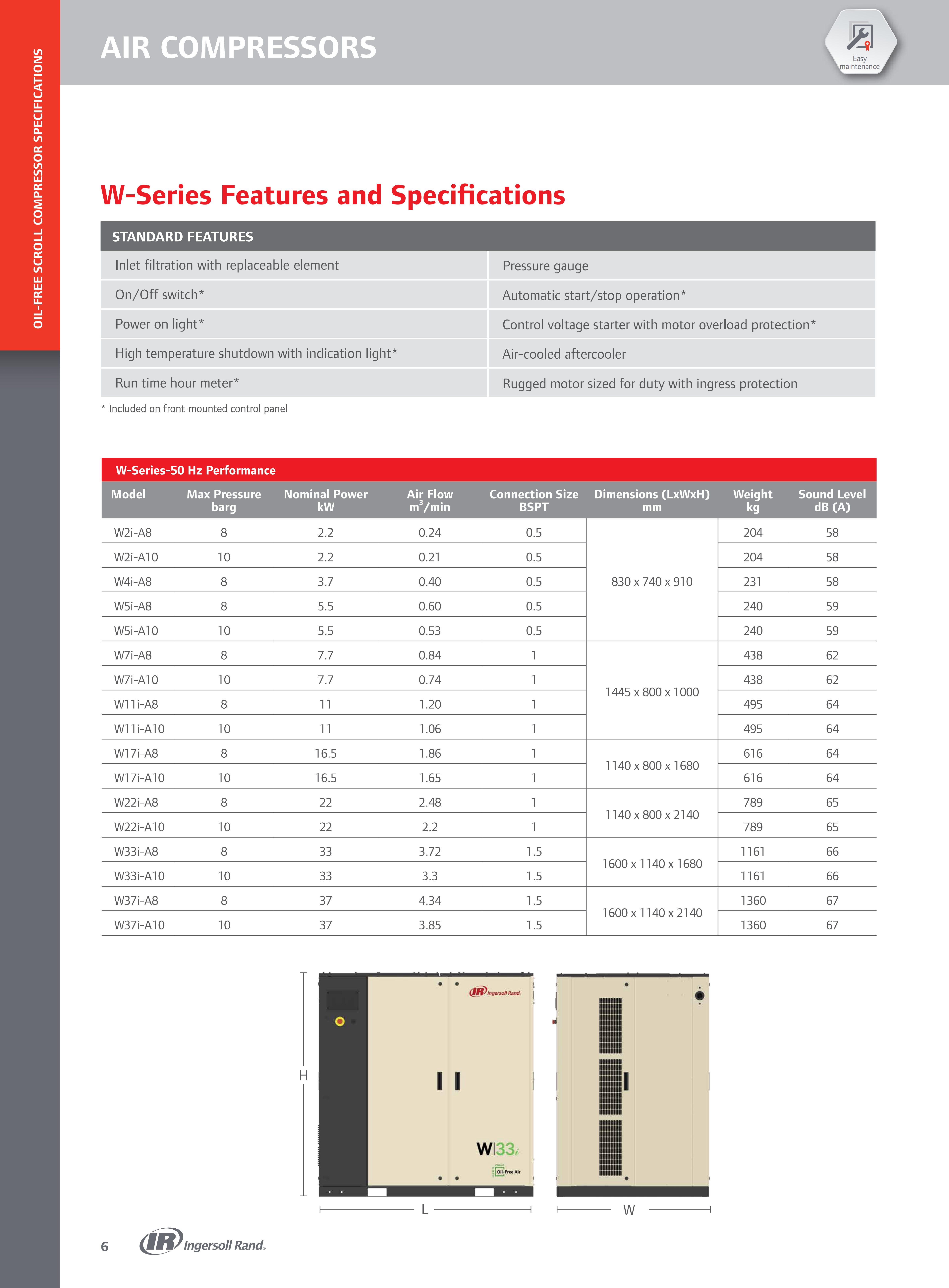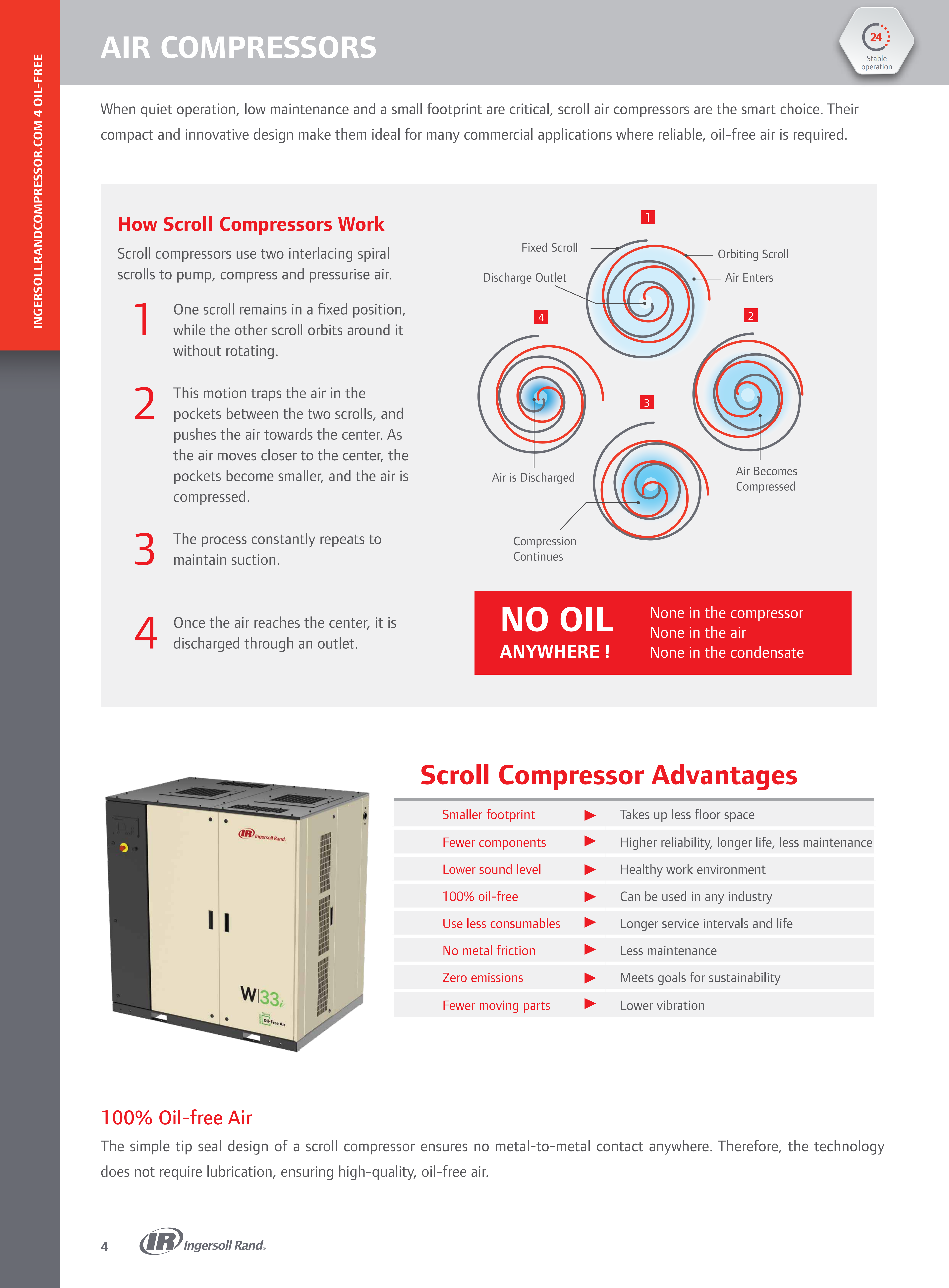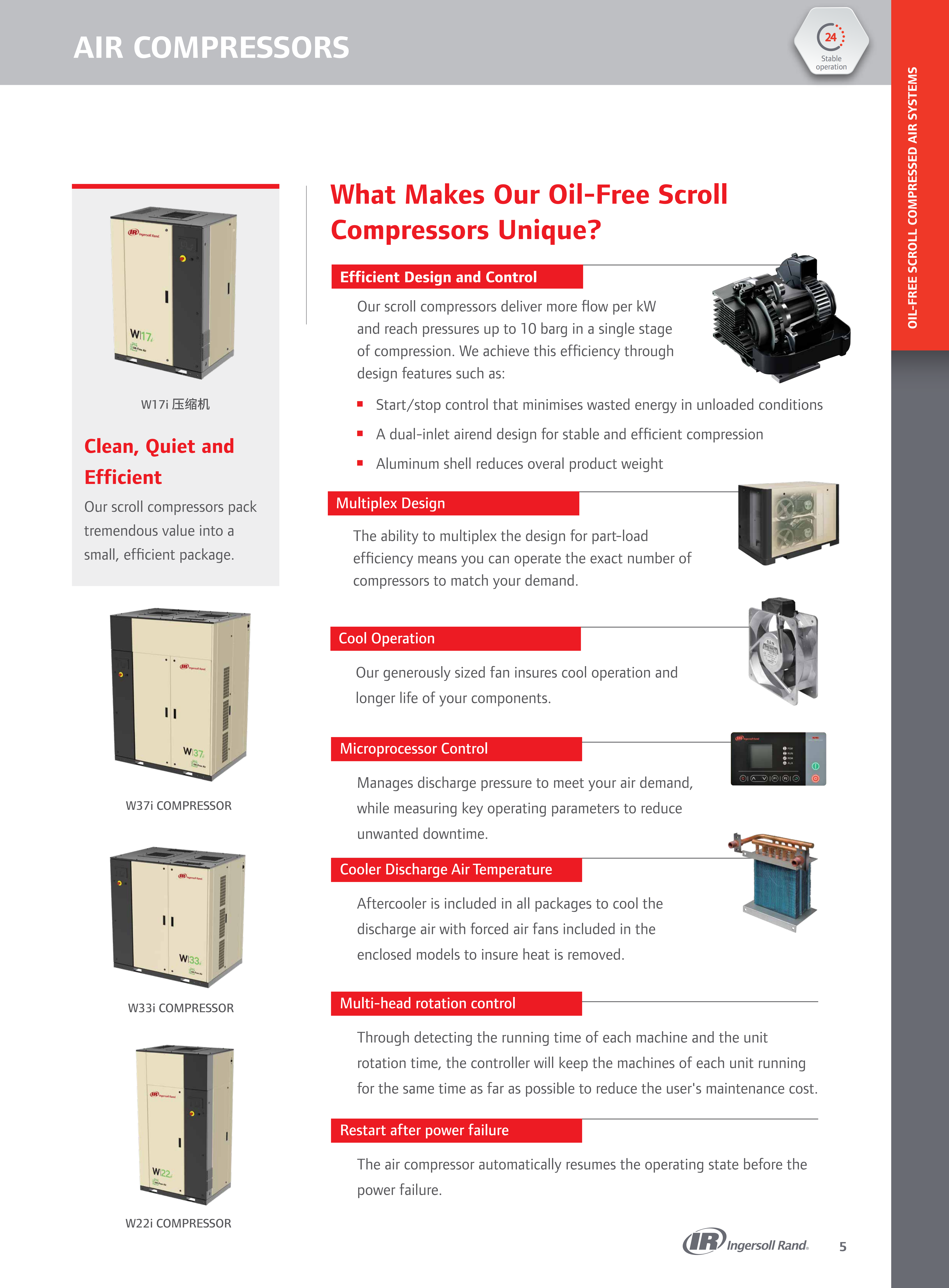 英格索兰(IR)W系列2-37kW无油涡旋空压机产品说明,核心介绍了该系列空压机的Class 0级无油空气品质、产品设计与工作原理、核心优势、全系列规格参数,以及配套的空气处理设备和全生命周期服务,主打为各行业提供高纯度、高可靠性的无油压缩空气解决方案,同时通过系统级服务降低客户总拥有成本(TCO)。
