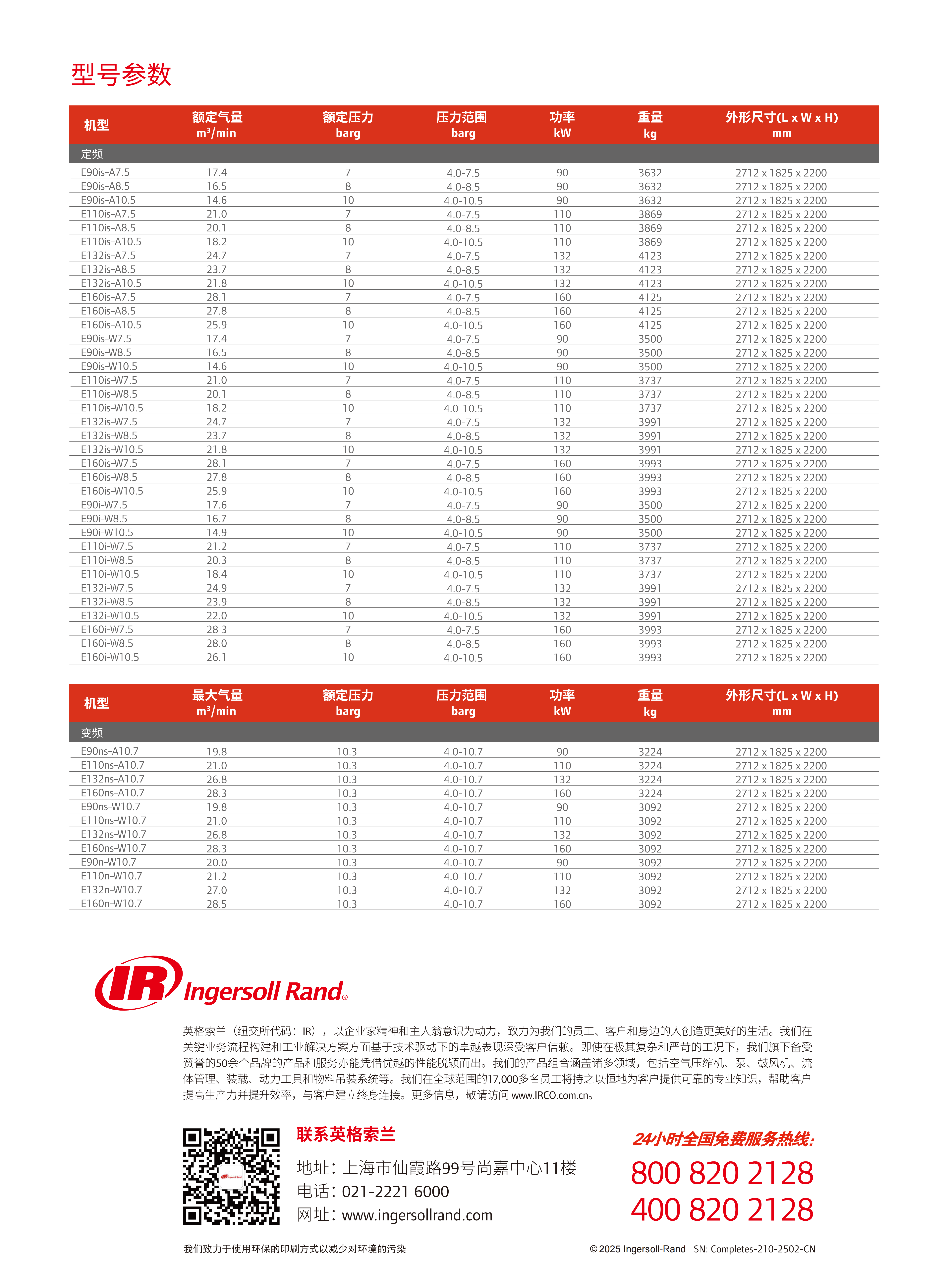 - 机型分类:涵盖定频和变频两大系列,各系列又分不同压力、功率版本,功率覆盖90/110/132/160kW,满足多样化工业用气需求。