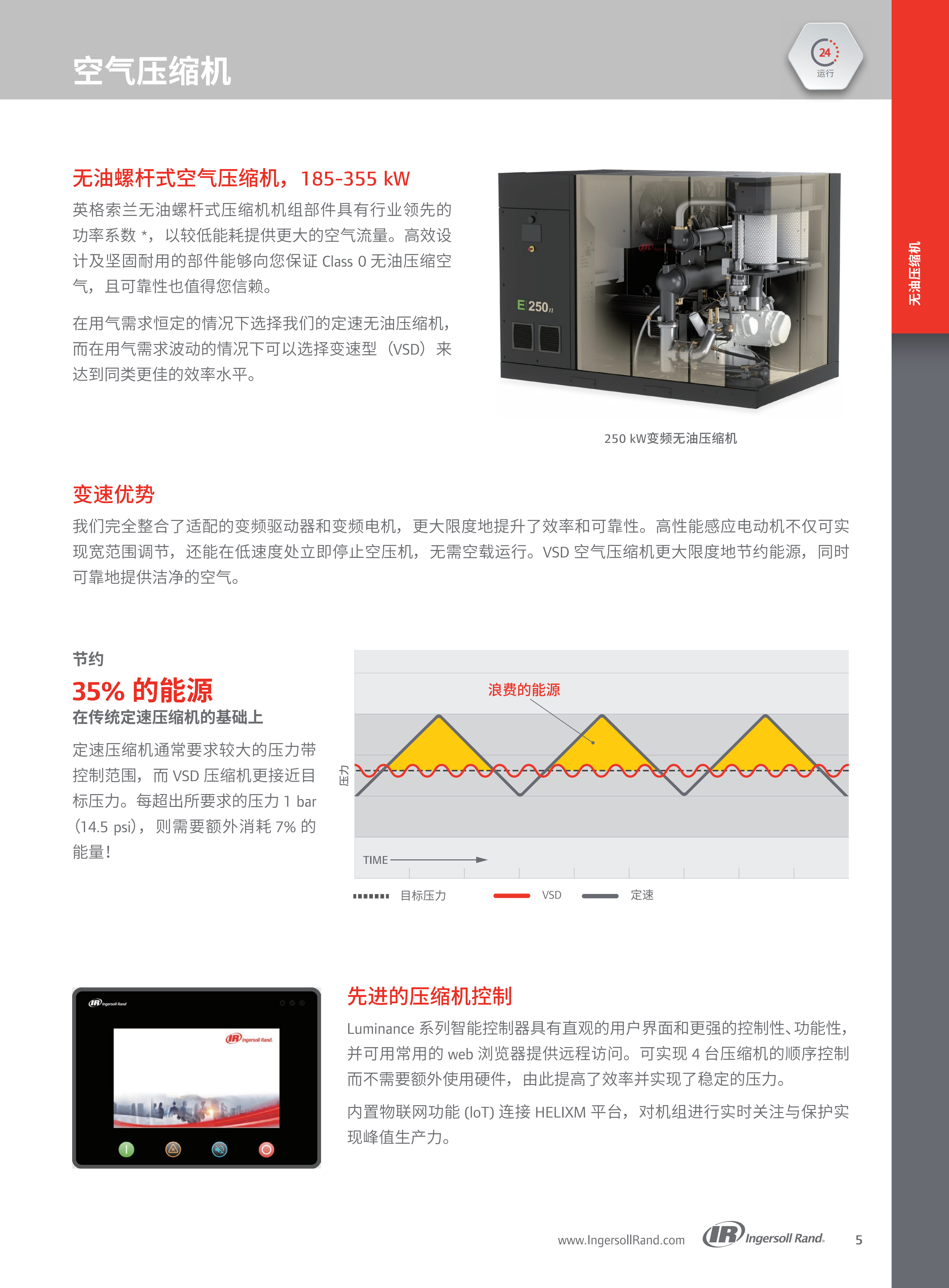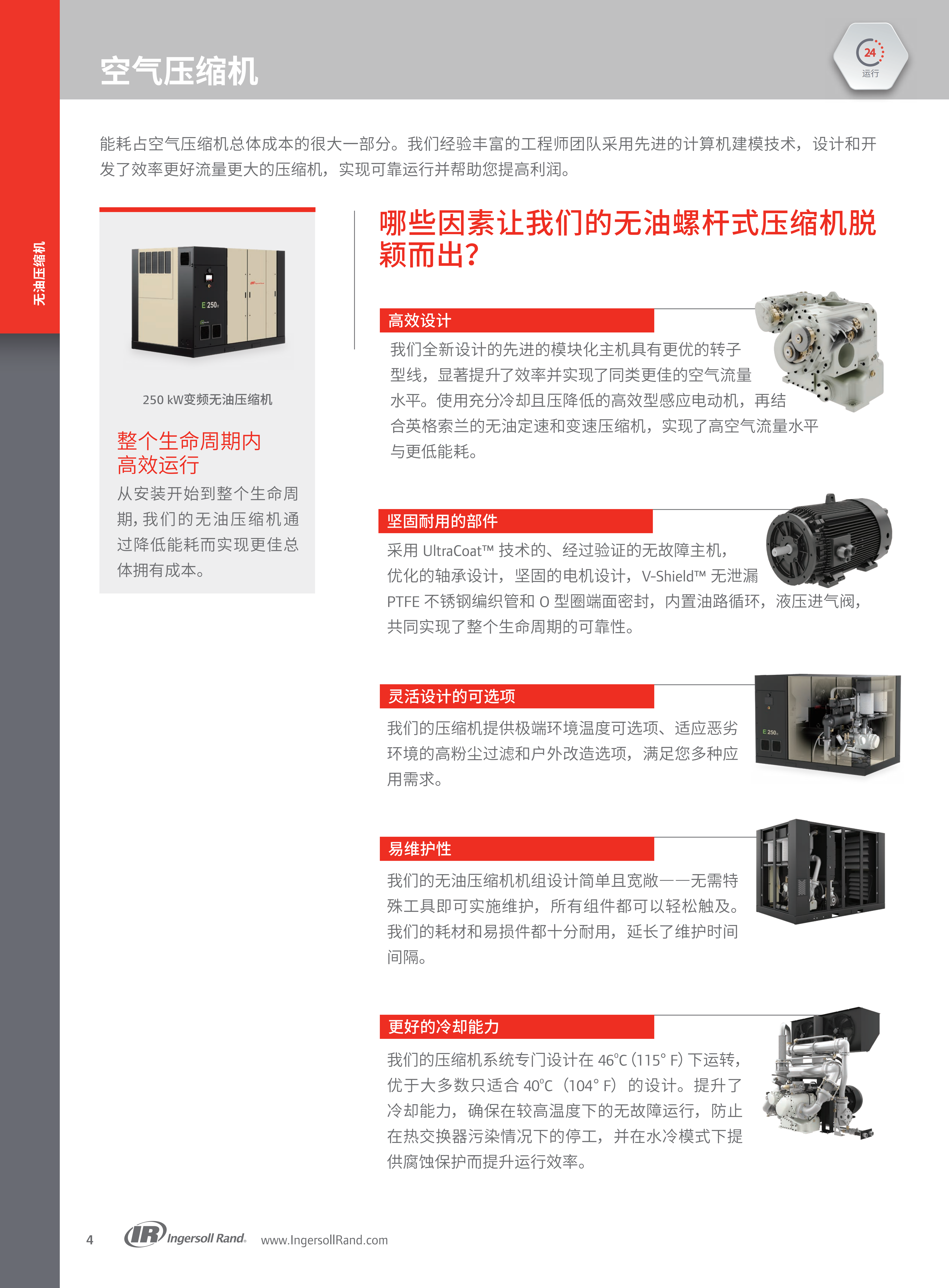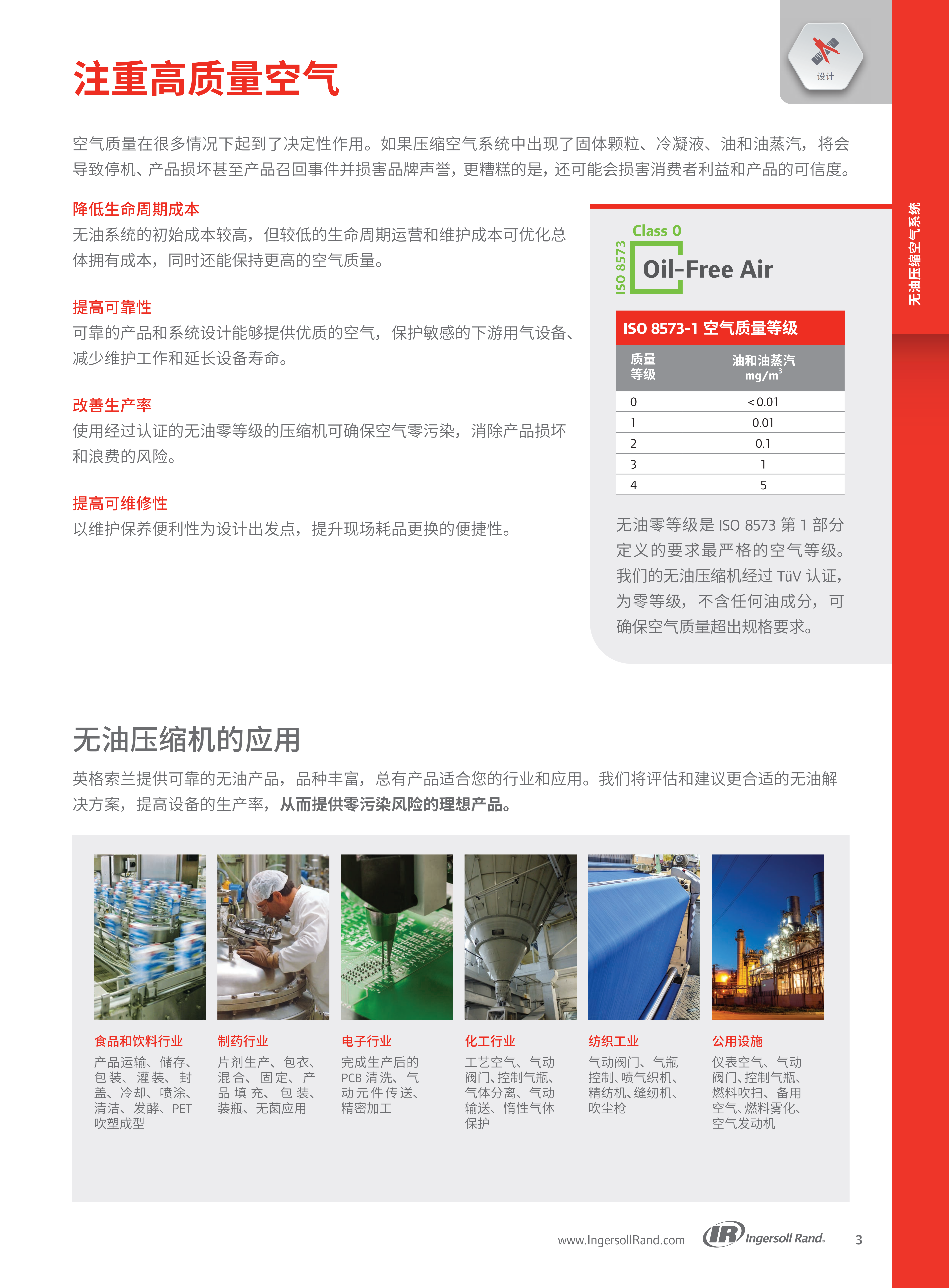本英格索兰185-355kW无油螺杆式压缩空气系统的产品及服务介绍,核心围绕Class 0级无油压缩空气展开,从产品技术优势、全系列配置、空气处理配套、原厂配件及全生命周期服务等方面,阐述其为各行业提供高效、可靠、低耗的压缩空气系统解决方案的能力,同时强调系统全周期成本优化与定制化服务。