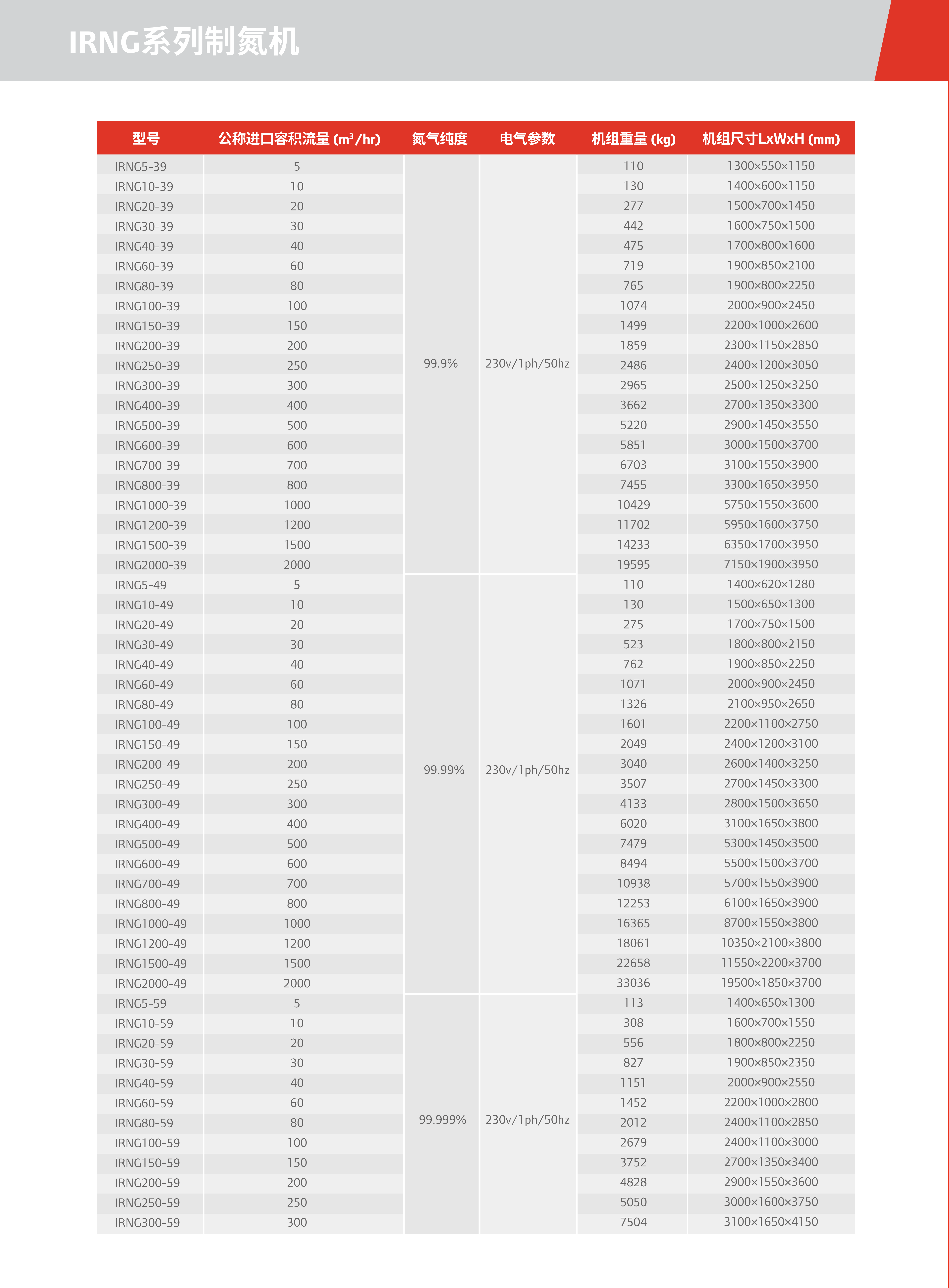 - IRNG-49系列:氮气纯度99.99%,2000 m³/h型号可达99.999%,处理量5-2000 m³/h;