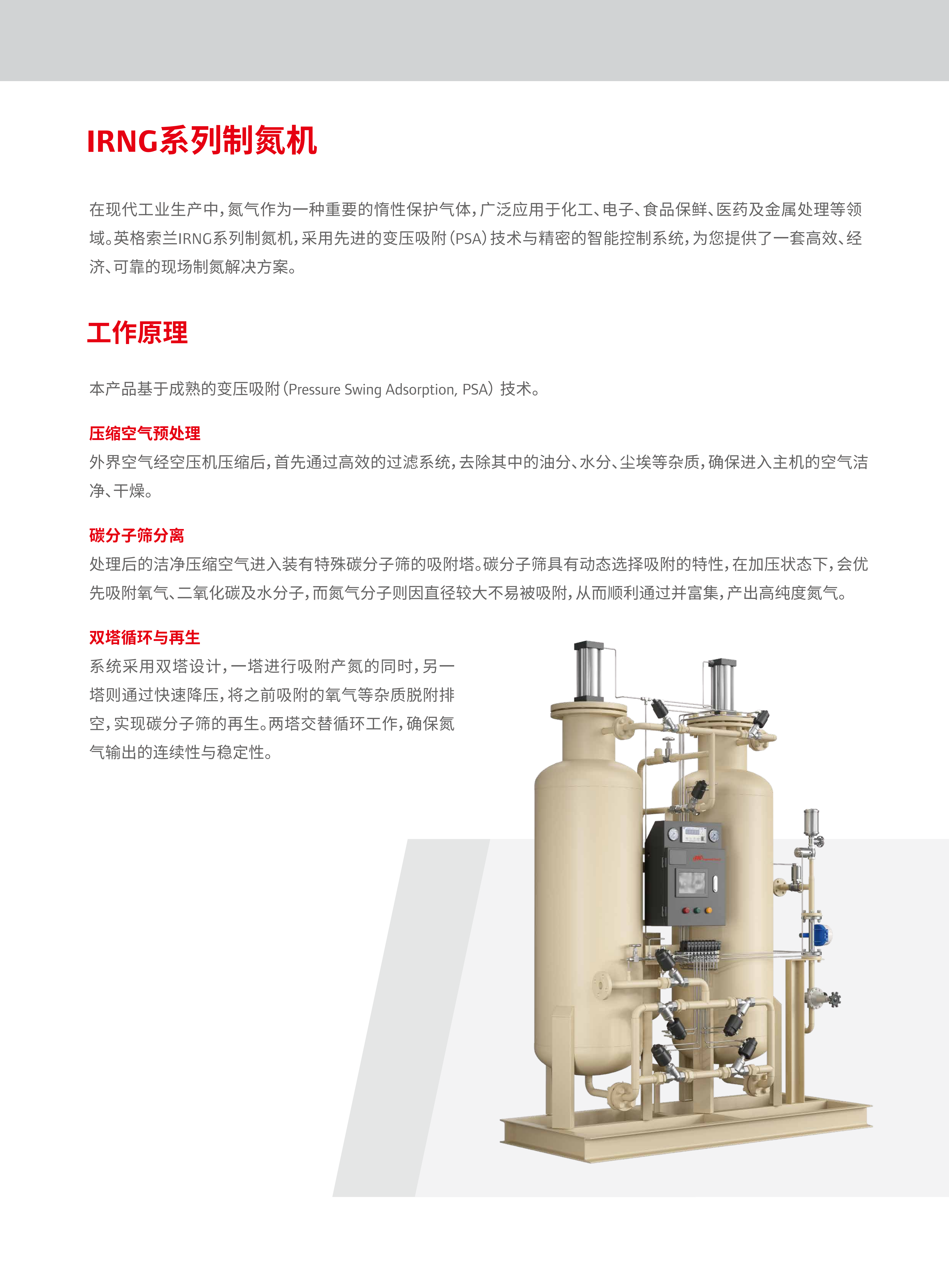 英格索兰IRNG系列制氮机依托变压吸附(PSA)技术与智能控制系统,为各行业提供高效、经济、可靠的现场制氮解决方案,氮气作为惰性保护气体,可满足多领域生产的核心用气需求。
