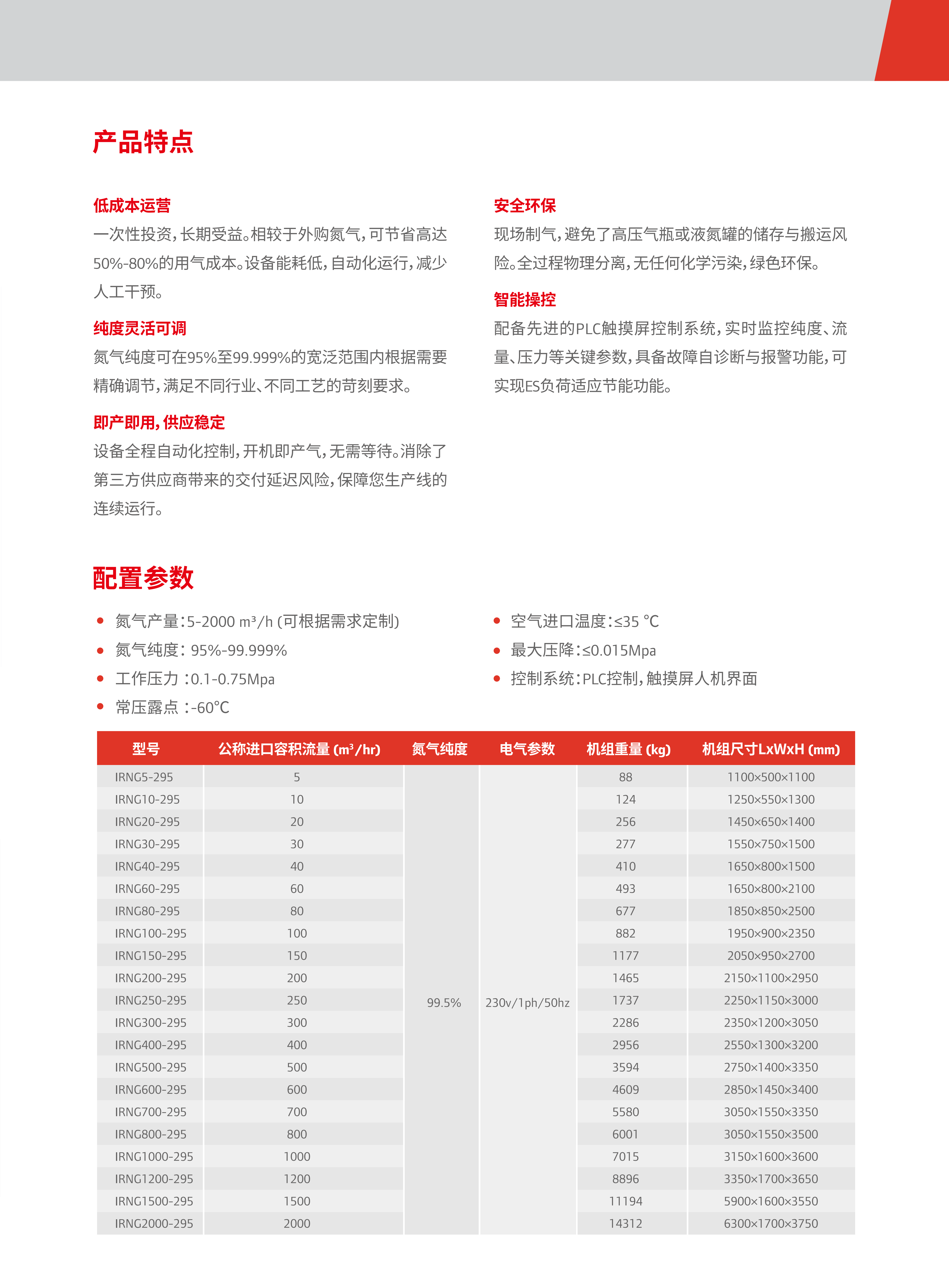- IRNG-295系列:氮气纯度99.5%,处理量5-2000 m³/h;